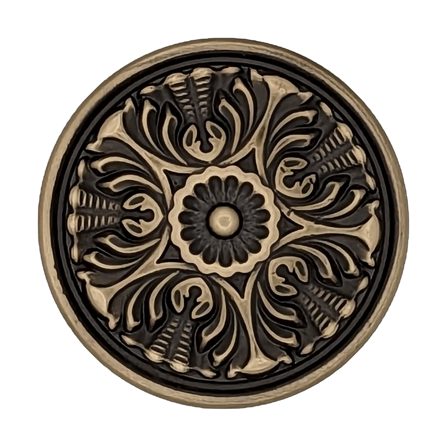 1 3/4 Inch Victorian Star Filigree Doorknob (Antique Brass Finish) - measures 1 3/4 inches in diameter with a projection of 7/8 inches. Crafted with ornate floral carving. Comes complete with the mounting screw. Available in Polished Brass, Satin Nickel, Antique Brass (shown), Oil Rubbed Brass, Chrome and Antique Nickel.