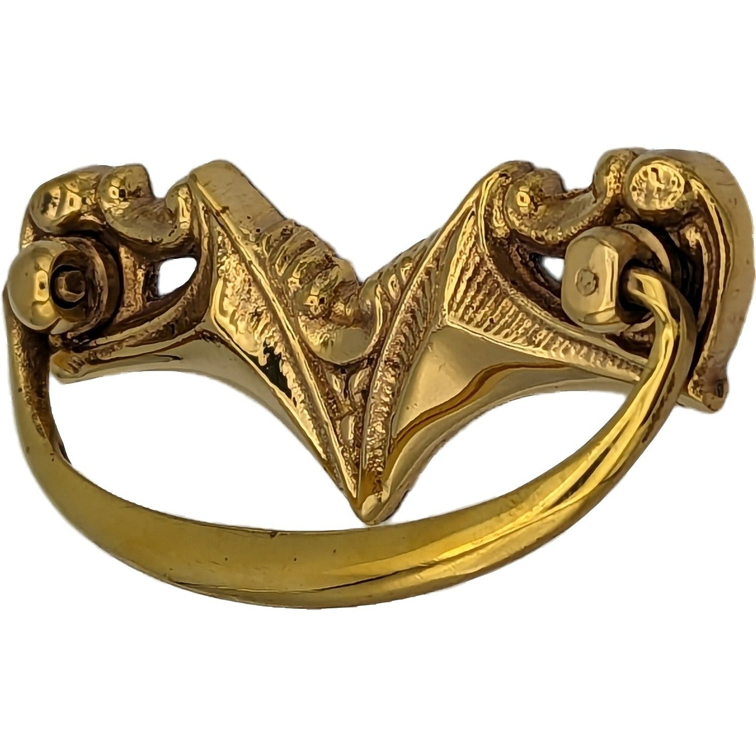 This uniquely crafted piece measures 3 5/8 inches overall with a mounting center-to-center distance of 3 inches. Pull projects 1 1/2 inches. Available in polished brass, antique brass and Black Bronze. Comes complete with mounting hardware.
