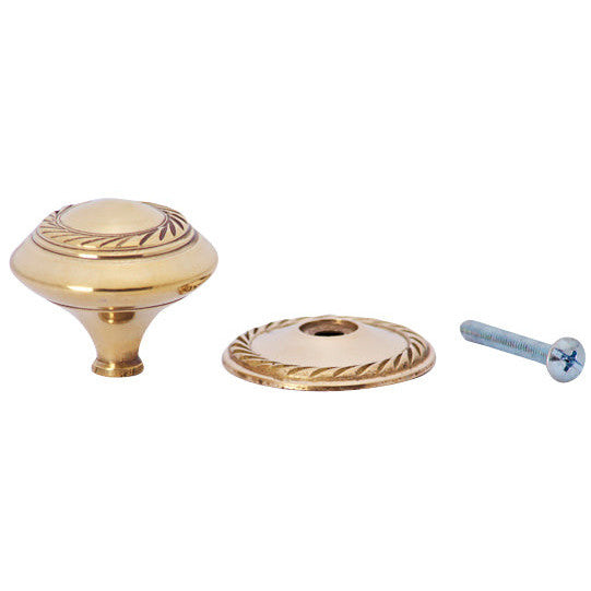 1 1/2 Inch Brass Round Knob with Georgian Roped Border and matching Back Plate (Polished Brass Finish). Measures 1 1/2 inch in diameter with a projection of 1 1/2 inch. Comes complete with the mounting hardware. Coordinating Pull is also available. Comes in several finishes including polished brass, antique brass, and Black Bronze.
