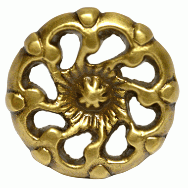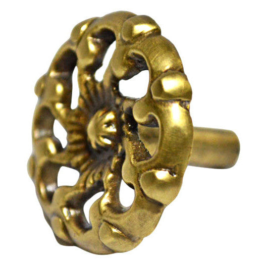 1 1/2 Inch Solid Brass Floral Wheel Round Knob (Antique Brass Finish). Measures 1 1/2 inch in diameter with a projection of 1 1/4 inch. This product is available in several other finishes and comes complete with mounting hardware.