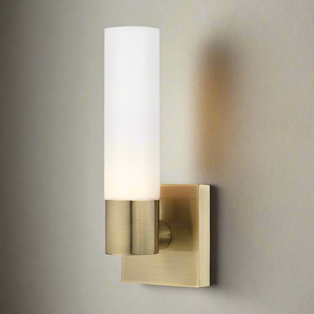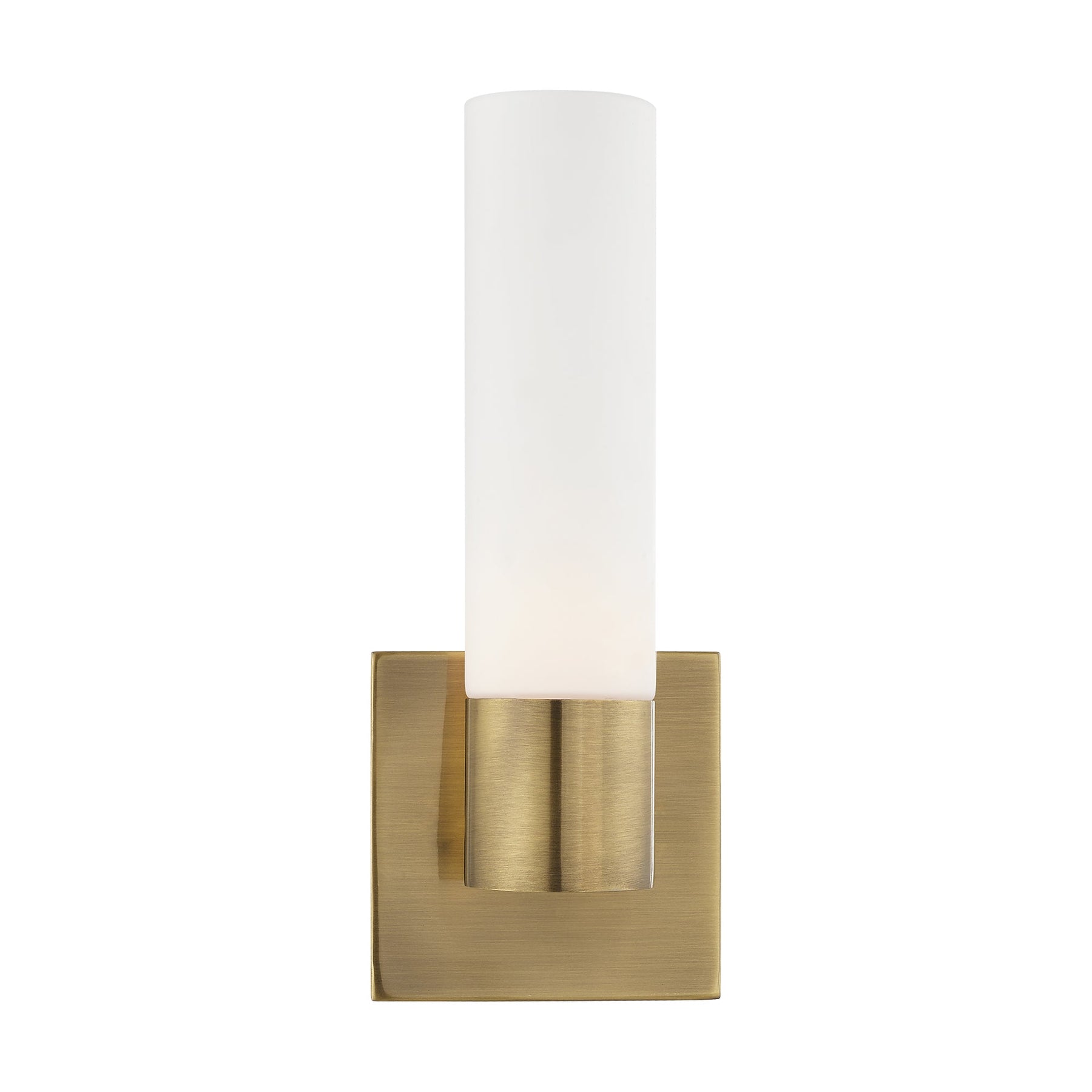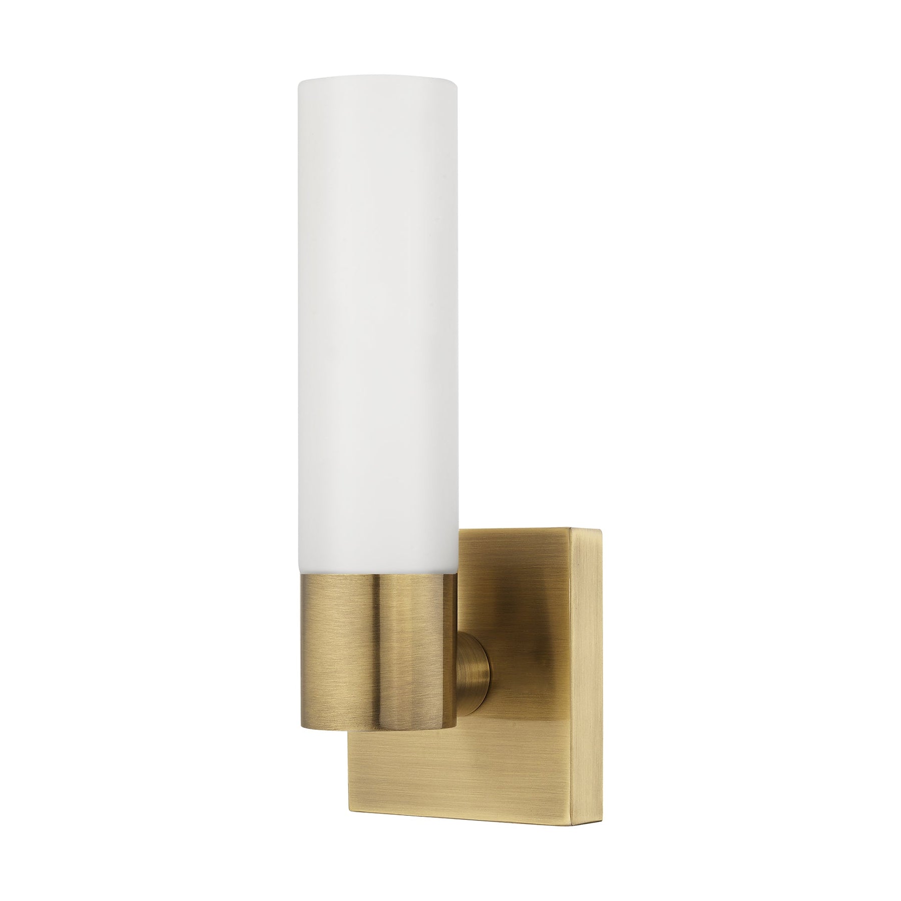 The Aero Wall Sconce in Antique Brass is a stunning addition to any contemporary space. With its elegant design, it provides a soft and flattering light through its hand-blown satin opal white twist lock glass shade. This fixture measures 4.5 inches in width and 11.25 inches in height, extending 4 inches from the wall. It requires one candelabra base bulb with a maximum wattage of 60W (bulb not included) and is rated for damp locations, making it a perfect choice for bathrooms and similar areas.