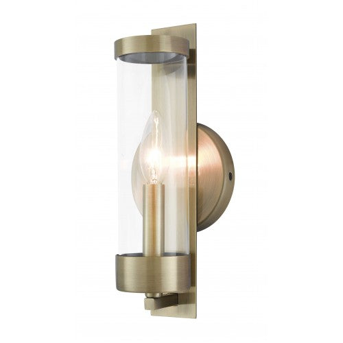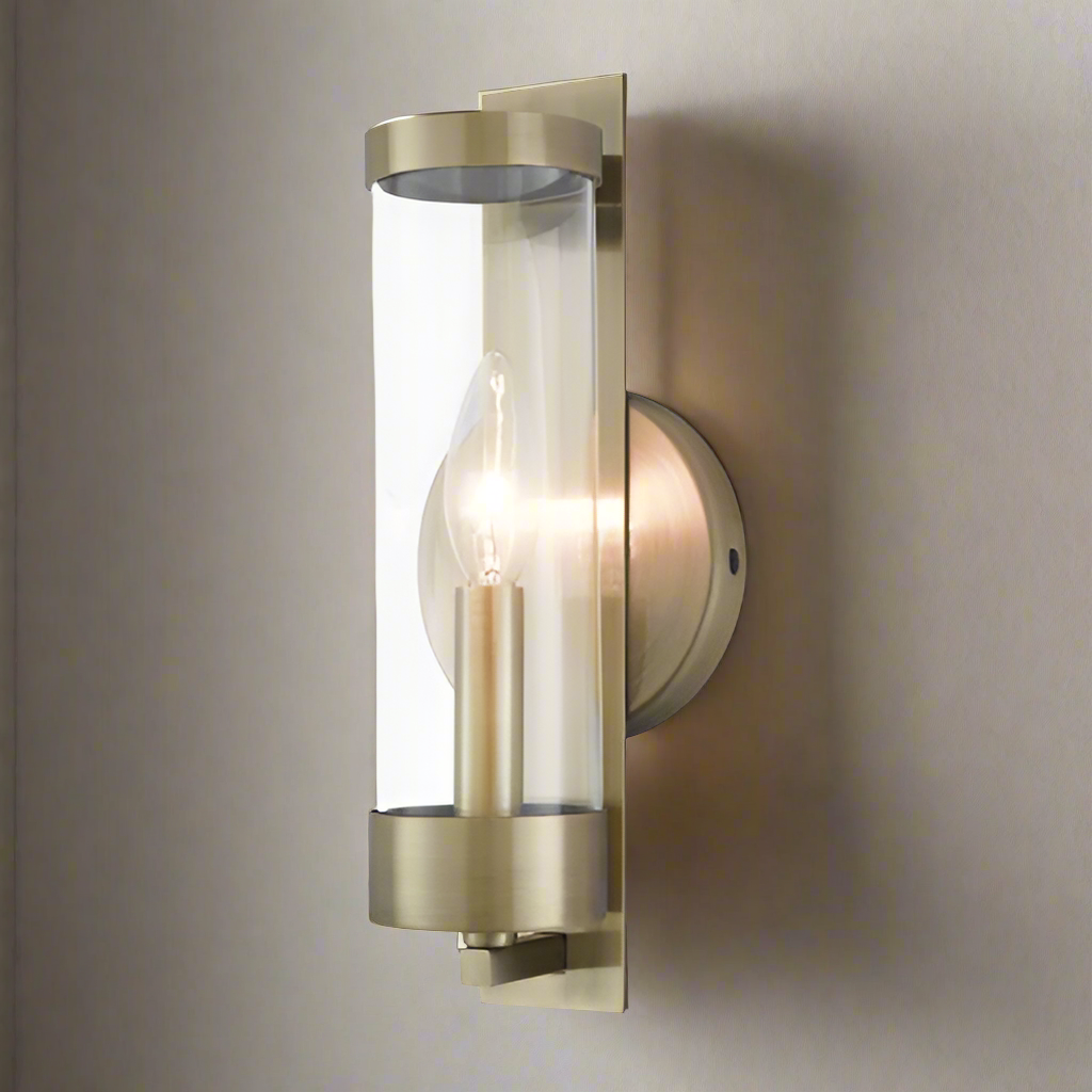 The Castleton Wall Sconce in Antique Brass offers a modern touch to traditional decor with its elegant design. This sconce features a clear glass cylinder that beautifully diffuses light and requires one candelabra base bulb (not included) with a maximum wattage of 60W. With dimensions of 4.75 inches in width and 12 inches in height, along with a 4-inch extension, it is perfect for enhancing various spaces. Additionally, its UL Damp rating makes it suitable for use in bathrooms and other humid locations.