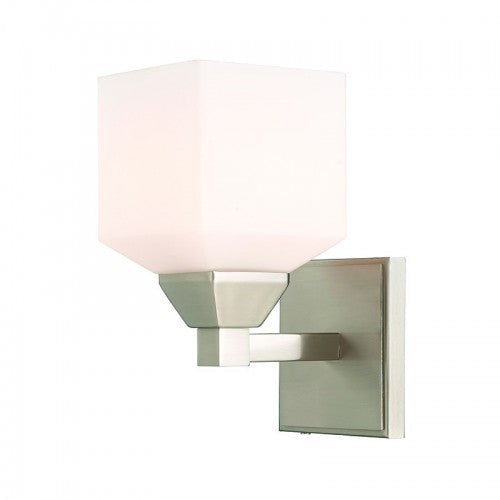 The Aragon Wall Sconce (Item Number: 10281-91) is a stylish addition to any space, offering both uplight and downlight features. This fixture, measuring 4.75 inches in width and 9.5 inches in height, is finished in a sleek brushed nickel that enhances its modern look. It includes a hand-blown satin opal white glass shade that provides soft, ambient lighting. Designed to accommodate a single medium base bulb (maximum wattage of 100W), this sconce is suitable for damp locations, making it perfect for bathrooms or other humid environments.