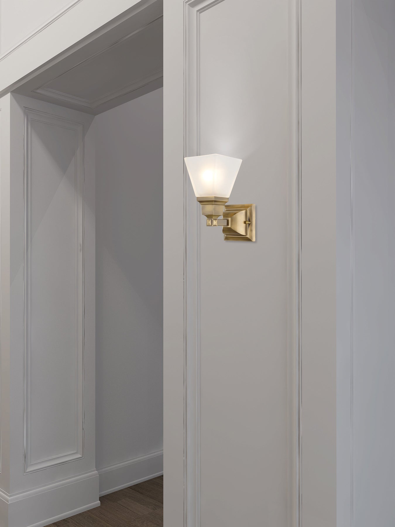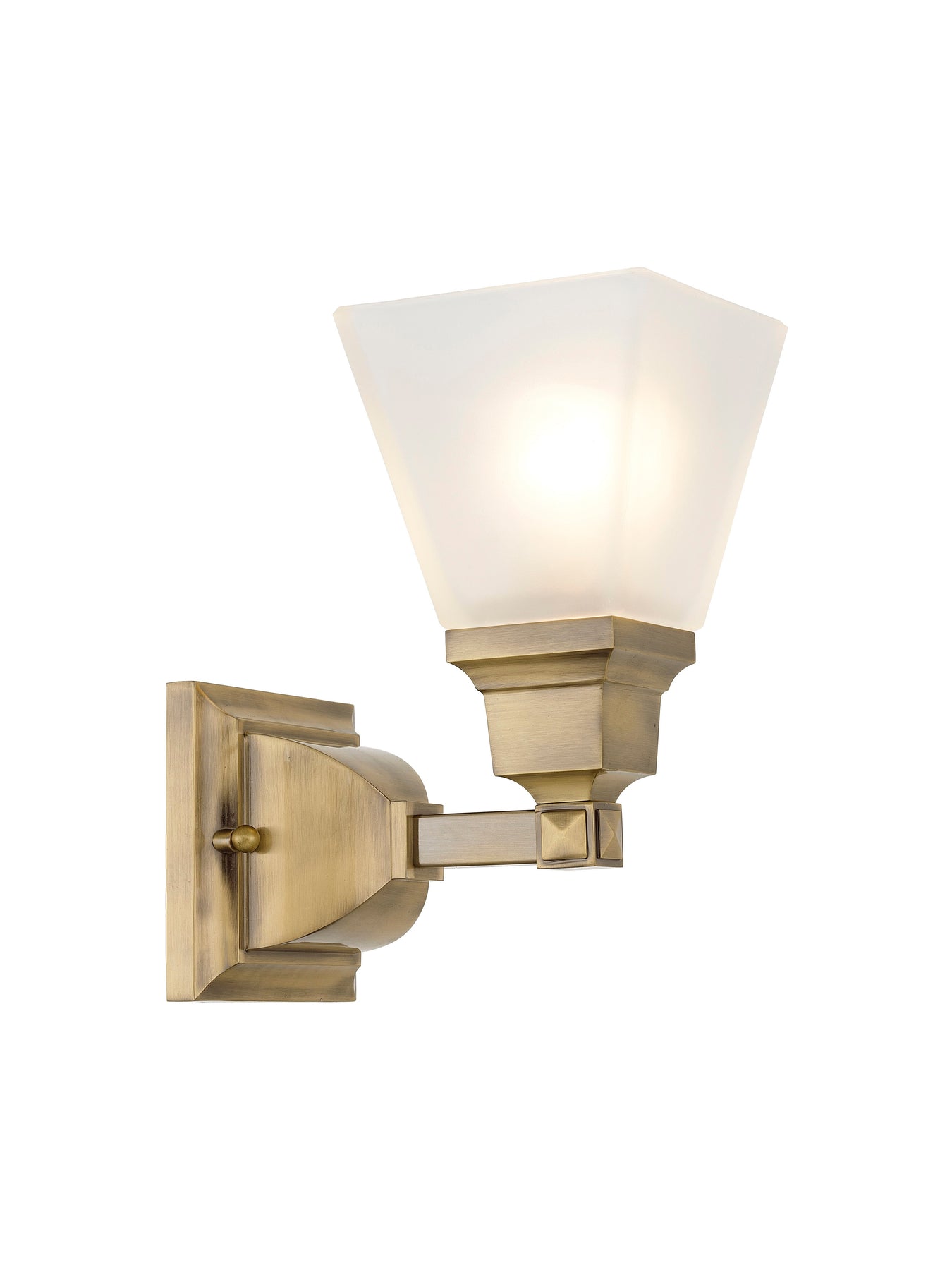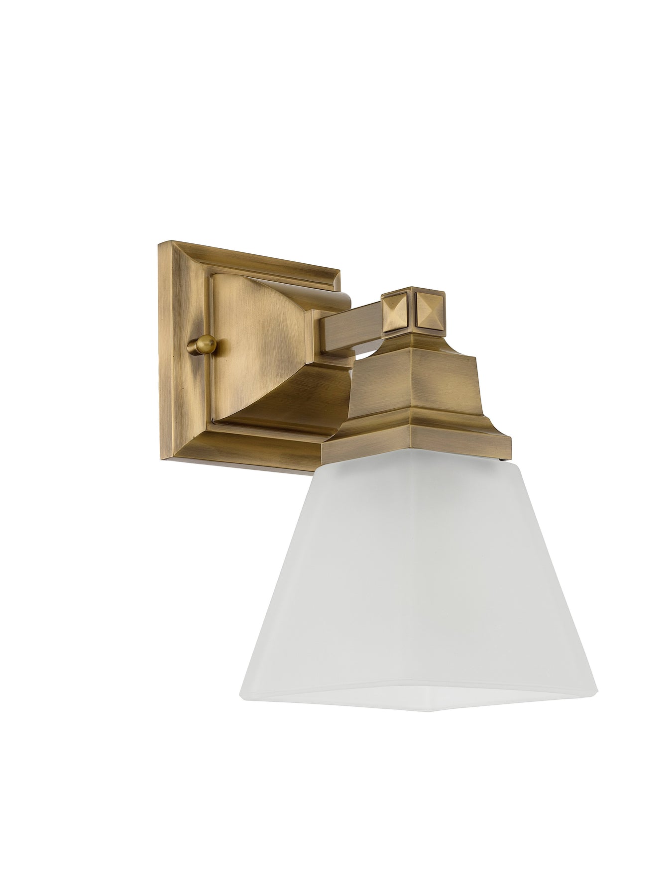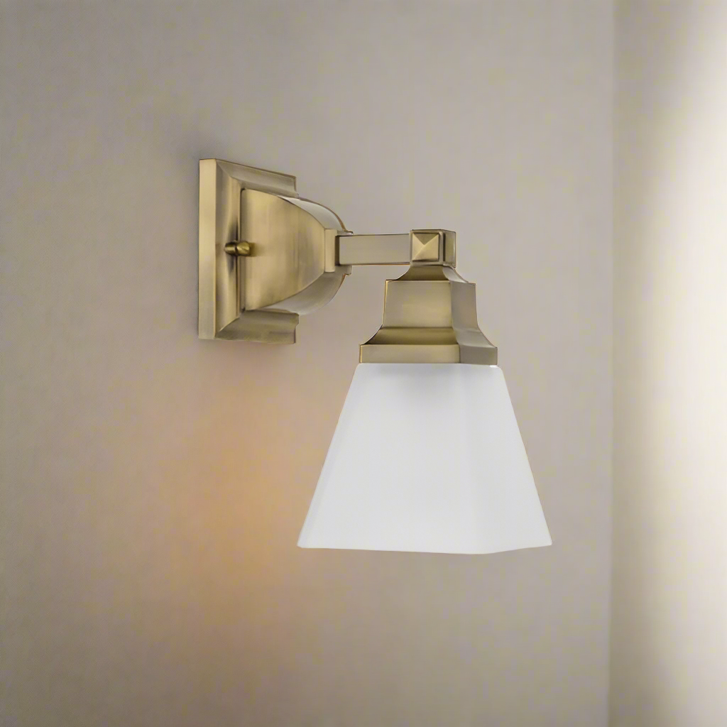 The 1031-01 Mission Bath Vanity light fixture offers a blend of transitional style with clean lines and geometric forms. Finished in antique brass, this one-light fixture features a beautiful etched opal glass shade, ensuring a soft and inviting glow. Measuring 5 inches in width and 9.5 inches in height, it has a 7.75-inch extension and is designed for wall mounting. With a medium base bulb requirement that supports up to 100W, this fixture is UL listed for damp locations, making it a suitable choice for bathrooms and other humid areas.