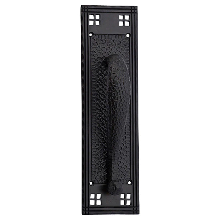 Measures 12 inch tall and 3 1/2 inch wide with a projection of approximately 2 1/2 inch. Craftsman Style construction for decades of service. These pulls come as natural unlacquered Brass and will patina over time. A high strength lacquer coating can be applied upon request to protect the natural bright finish. Comes complete with mounting hardware. Available in either a polished brass or Black Bronze finish. Coordinating push plates and individual door pull also available.