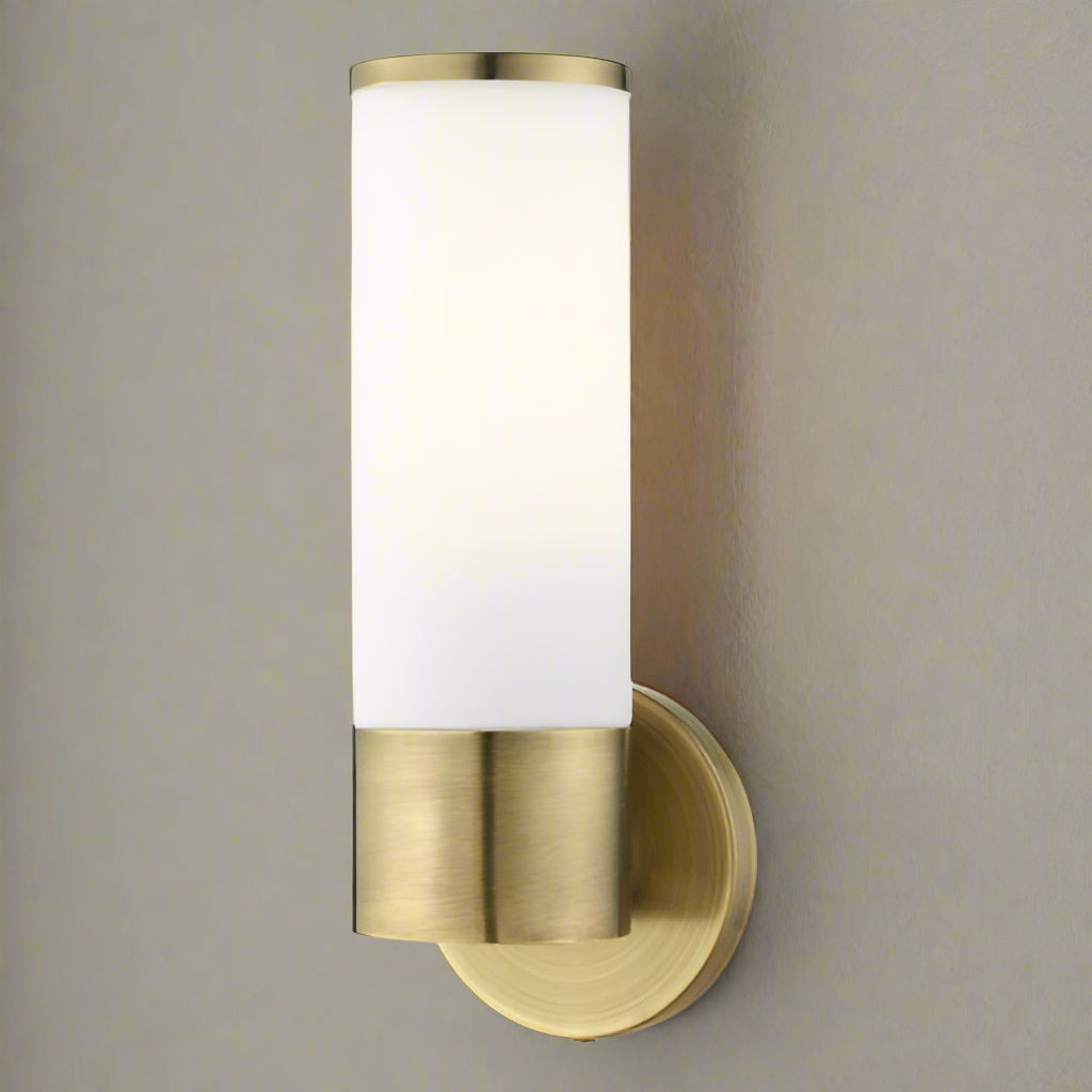 The 16561-01 Lindale Single Sconce in Antique Brass is an ideal lighting addition for those who appreciate contemporary and minimalistic design. Measuring 4.25 inches in width and 11.25 inches in height, this fixture features a downlight option at 2.25 inches high and an uplight option at 9 inches high, accommodating a medium base bulb with a maximum wattage of 60W (bulb not included). The sconce is crafted from durable steel and showcases a satin opal white glass shade, presenting a sleek and urban aesthetic perfect for various decors. UL listed for damp locations, it blends upscale charm with modern functionality.