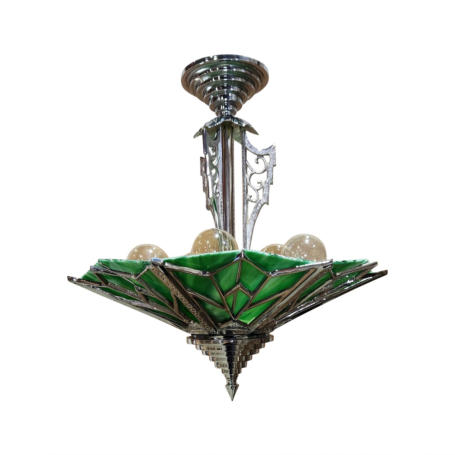 This item is hand crafted from solid brass using the Lost Wax casting method and this comes with stained glass panels that are made in Michigan. The chandelier's overall height measures 17 inches with a 16 1/2 inch diameter. This close ceiling light is made from solid brass construction and weighs approximately 12.5 pounds. This uses five bulbs (maximum of 50 Watts each) and this fixture comes complete with the mounting hardware.