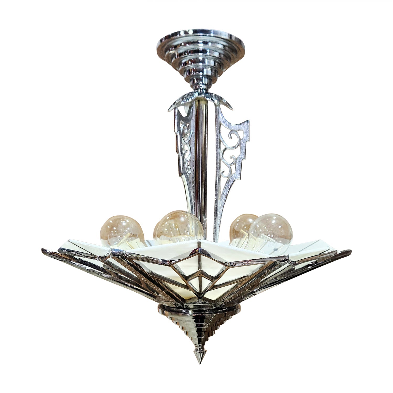 Illuminate your space with timeless elegance using the 17-inch Classic Art Deco Close Ceiling Light in a polished chrome finish. The exquisite white stained glass casts a soft and inviting glow, while the sleek lines and Art Deco design add a touch of sophistication to any room. Elevate your interior with this meticulously crafted ceiling light, where form and function harmonize to create a statement piece that transcends trends.