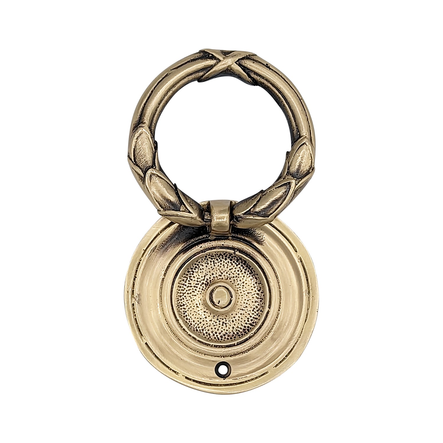 Hand finished and constructed from solid brass, these drawer ring pulls measure 2 3/4 inch in diameter with a 3/4 inch projection. Available in antique brass, Black Bronze and Satin Nickel.