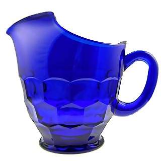 This complete water pitcher set is handmade in the United States for lookintheattic & company. The color is Cobalt or Dark Blue. The glass pattern is called Georgia and the set includes one 26 ounce glass pitcher and 6 ounce tumblers in a set of four. The glass pitcher measures 6 1/2 inches tall and 8 inches from spout to handle. The 6 ounce tumblers measures 3 1/4 inches tall.