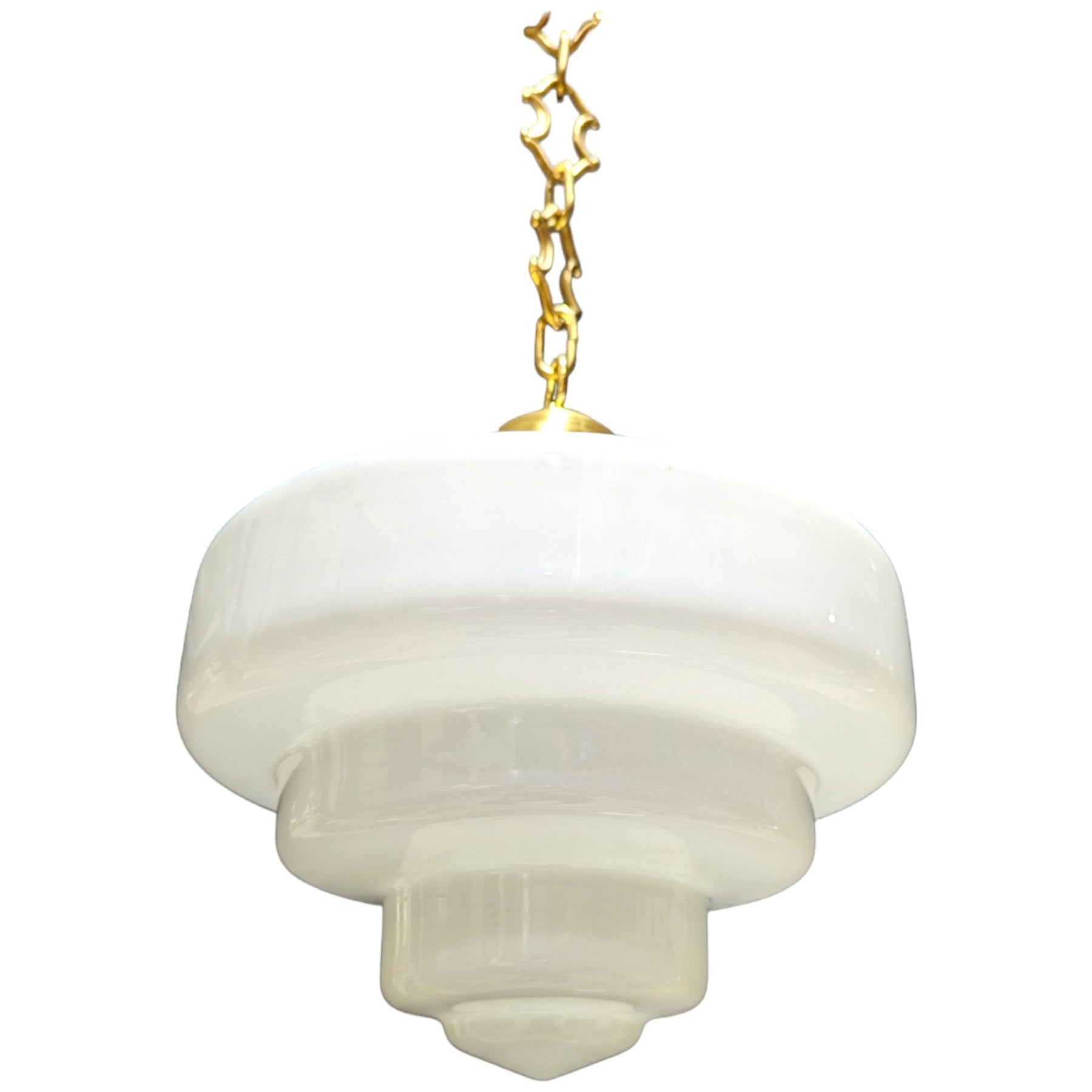 The 28 1/2 Inch Manhattan Skyscraper Nouveau Style Chain Light, with its graceful traditional lines and Satin Brass finish, will bring sophistication and grandeur to your home. Its tasteful design and stately construction make this light fixture the perfect centerpiece in any room.