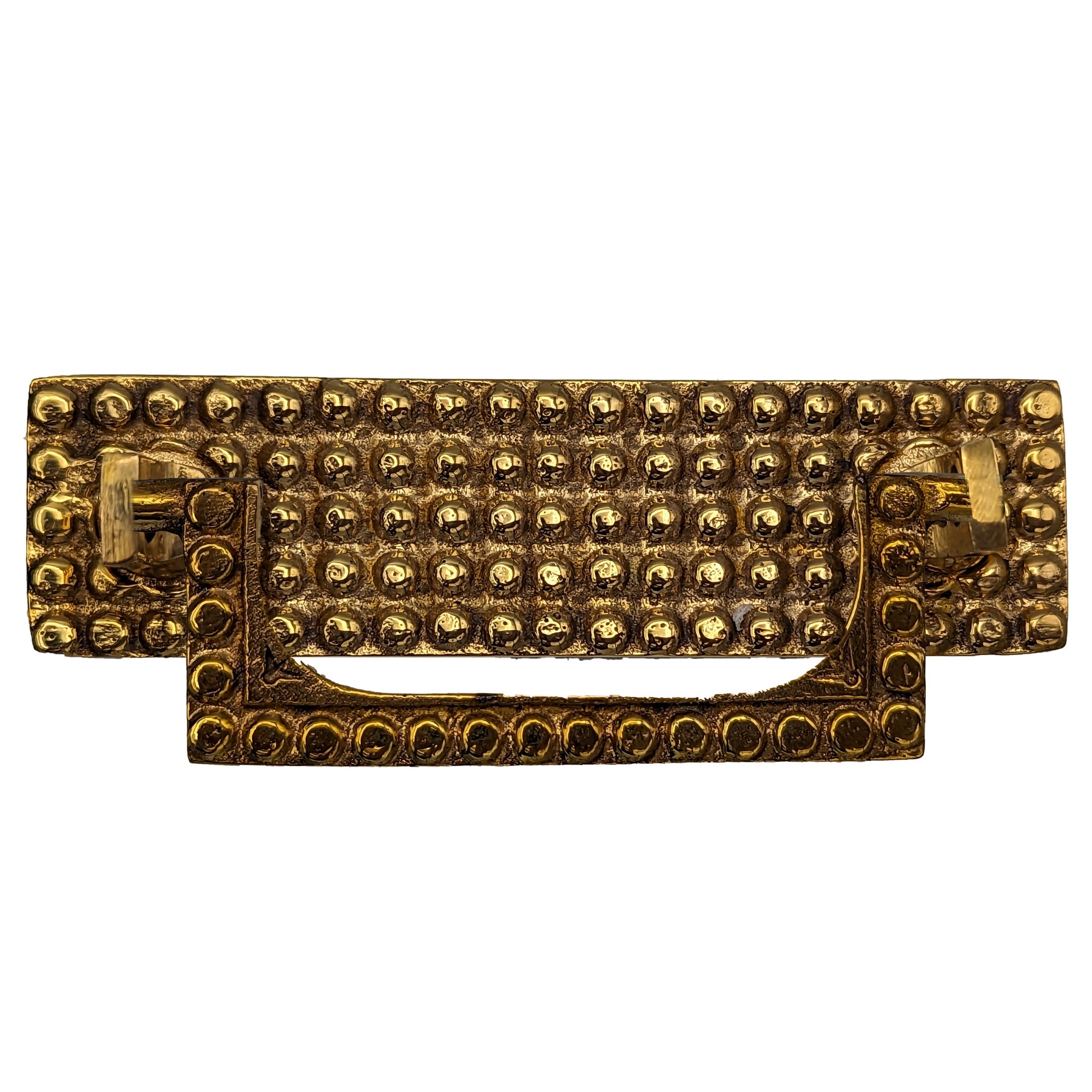 The plate measures 3 3/8 inches long and 7/8 inches tall with a center to center mounting distance is 2 1/2 inches. Hand-finished detailing. This pull handle has a projection of approximately 1 1/2 inches.