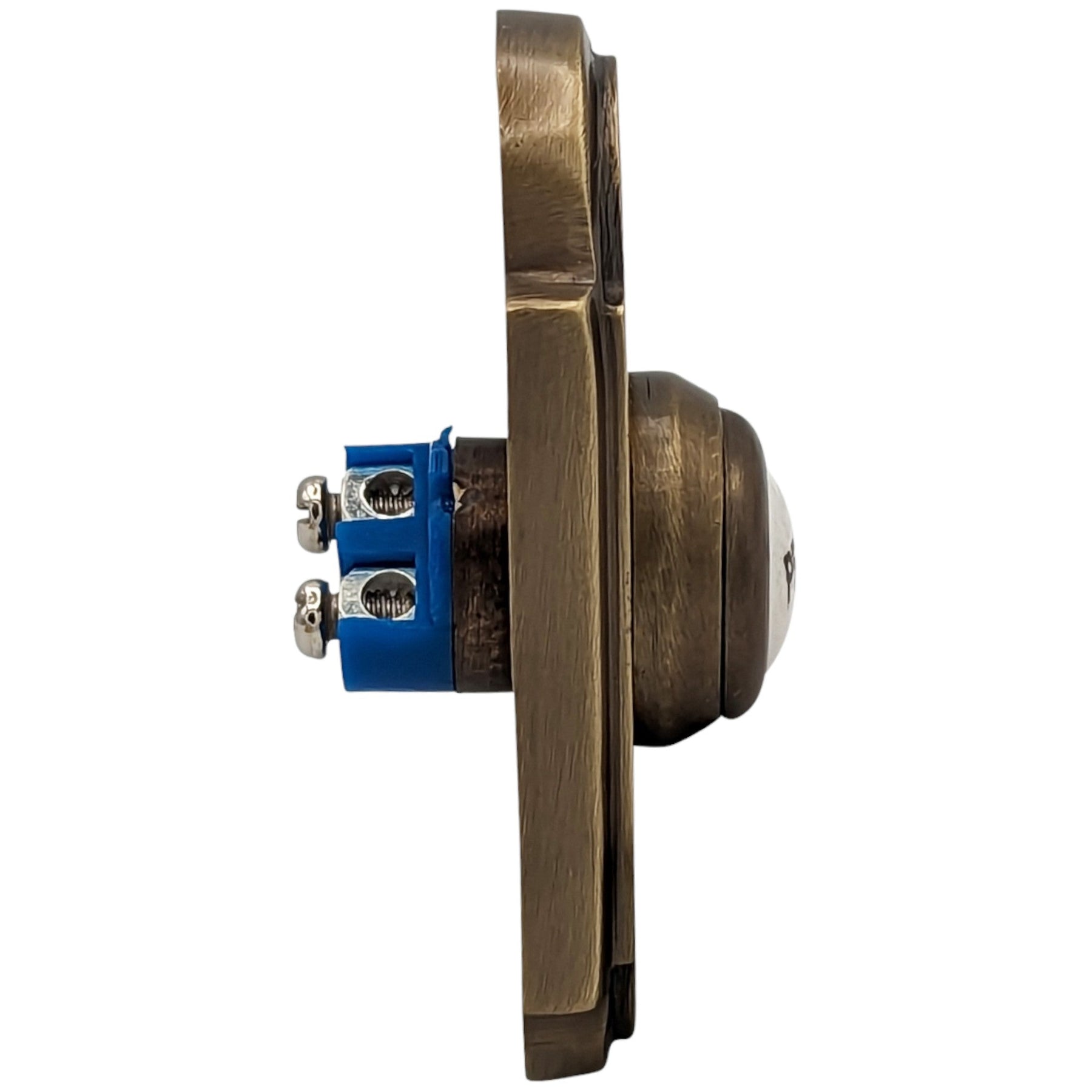 This doorbell button mounts with two brass screws (included). Measures 3 inches tall by 1 1/3 inches wide. Uses 24 volt maximum (standard doorbell circuits).