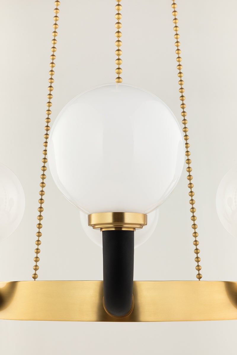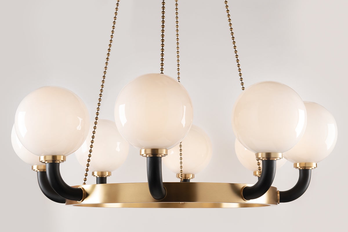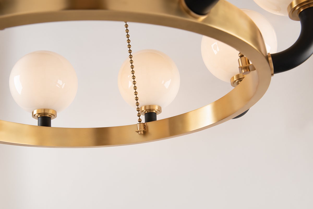 The elegant Hudson Valley Lighting Werner chandelier features a striking design with a width of 46.00 inches and a height of 14.50 inches. Adorned with a beautiful opal glass shade, it provides a warm and inviting ambiance with its eight lamps, each accommodating a 60-watt E26 medium base bulb (bulbs not included). This fixture is available in a chic Aged Brass/Black finish, enhancing its modern appeal. With a UL Damp rating, it's suitable for use in various environments, allowing for versatile placement in your home.