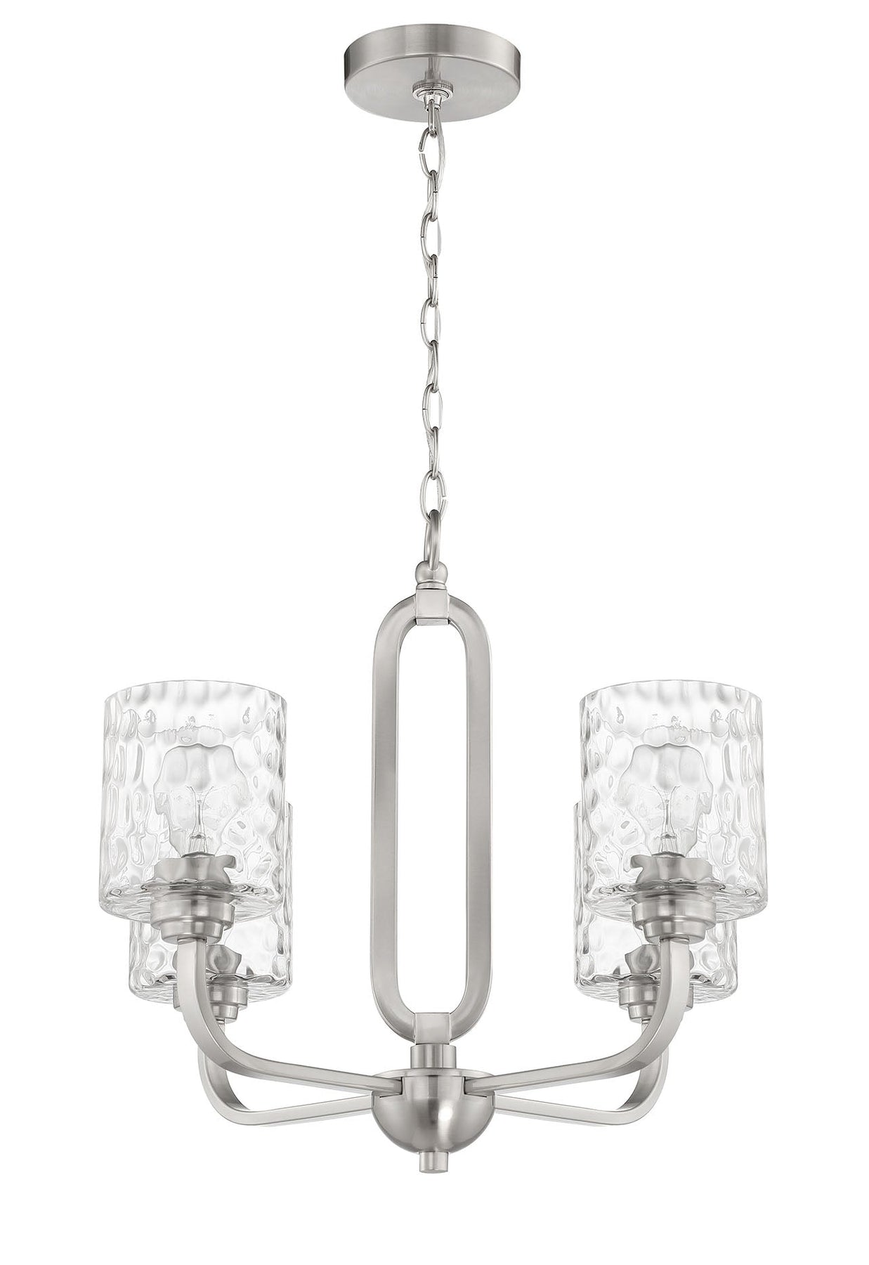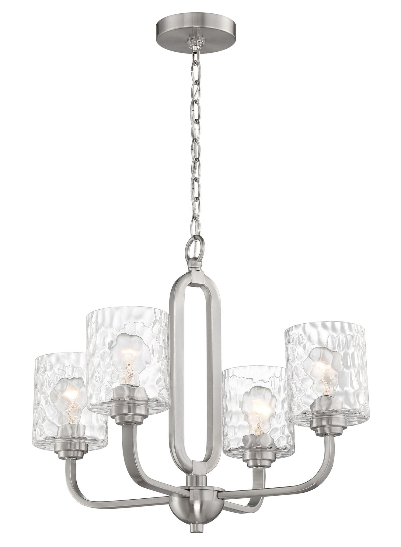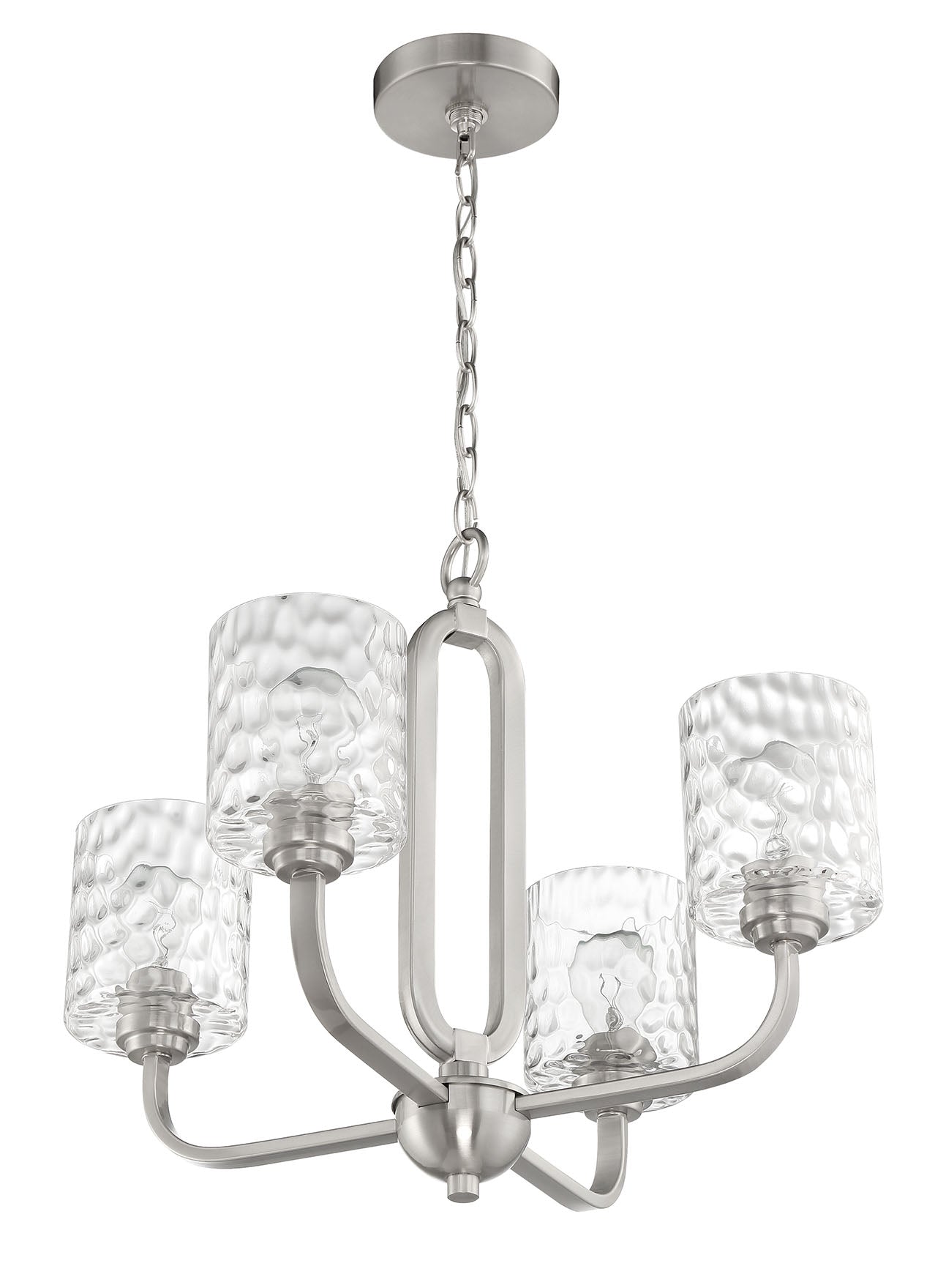 The Collins 4 Light Chandelier in Brushed Polished Nickel is a stunning addition to any indoor space, combining elegance with modern design. This chandelier features four A-Type bulbs with a medium base (E26) and a maximum wattage of 60W each, providing a warm, inviting glow. With dimensions of 23.75 inches in both width and depth, and a height of 18.75 inches, it is proportioned beautifully for various settings. The chandelier is equipped with a 6FT chain for adjustable mounting and comes with a 1-year limited warranty, ensuring longevity and satisfaction. The chic hammered glass shades blend seamlessly with the graceful geometric elements, making it an eye-catching centerpiece in your home.