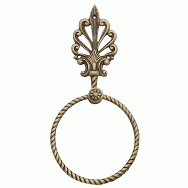 Fleur De Lis Towel Ring (Antique Brass Finish). Fleur De Lis part measures 4 1/2 inch tall and 3 inch wide with a projection of 1 3/4 inch. The ring measures 5 inch in diameter. Comes complete with mounting hardware. Available in several different finishes including antique brass, polished brass, and Black Bronze.