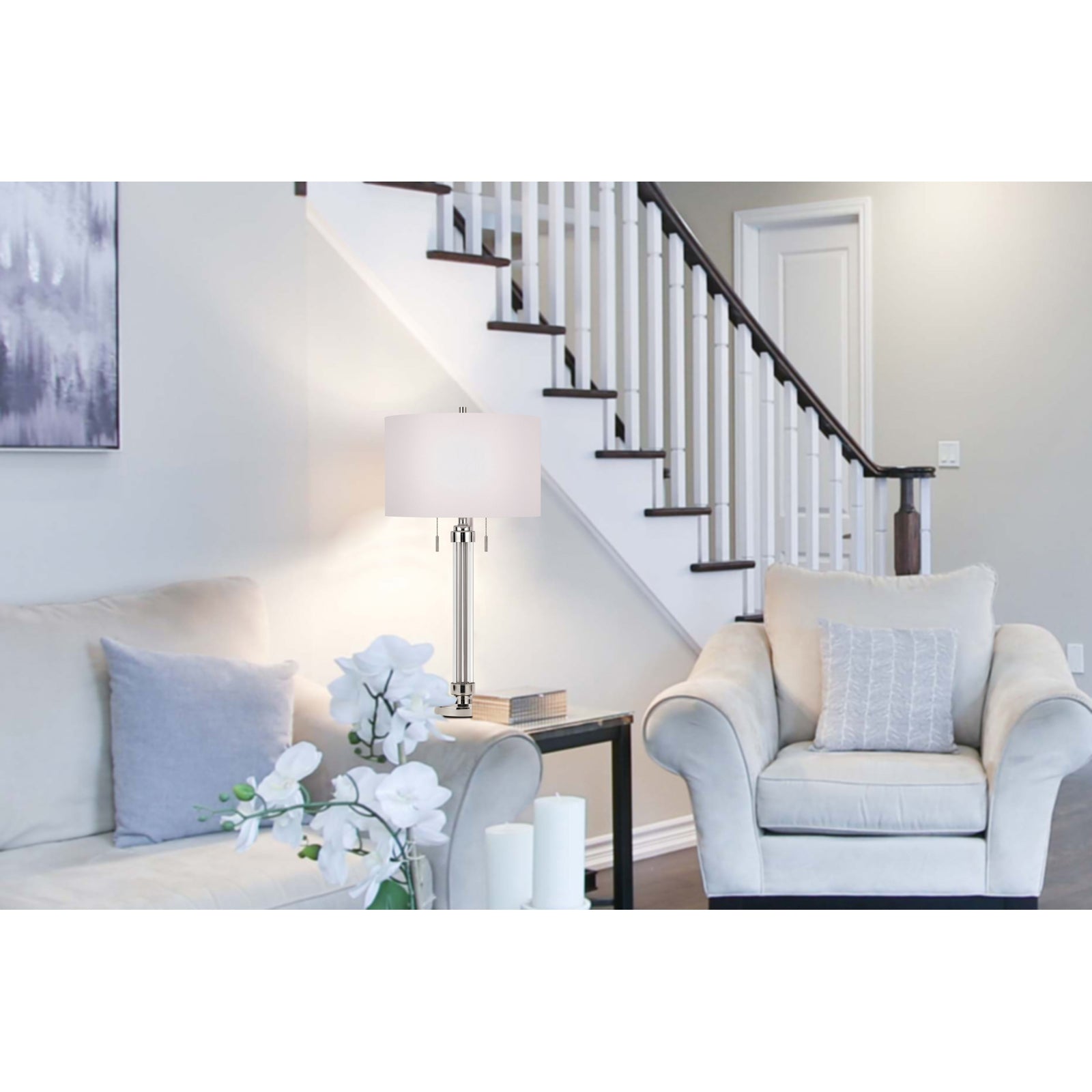 The Montilla Metal/Acrylic Table Lamp, product number BO-2829TB, offers a modern lighting solution with its 31-inch height and brushed steel finish. This lamp features a durable metal construction and an acrylic outer shell, ensuring longevity and style. It includes a fabric drum shade that diffuses light beautifully and operates through a convenient pull chain switch mechanism. Designed to accommodate two 60W bulbs, it ships in one carton and requires assembly. With a base color of chrome, this elegant lamp is ideal for enhancing any interior space.