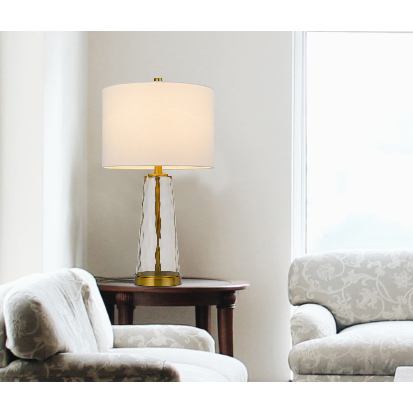 The BO-3059TB-2 100W Heber glass table lamp is a stunning addition to any room, sold as a pair for added value. This lamp boasts a durable metal and glass construction with a light smoke ripped glass body, exuding a touch of glam. Each lamp is topped with a hardback linen shade for a polished finish. With little to no assembly required and packaged in a single carton, it is designed for convenience. It operates with a standard E26 bulb base and features an ON/OFF switch, making it practical for daily use. Measuring 14 inches in length and width, and 26 inches in height, this elegant lamp set is perfect for enhancing your decor.
