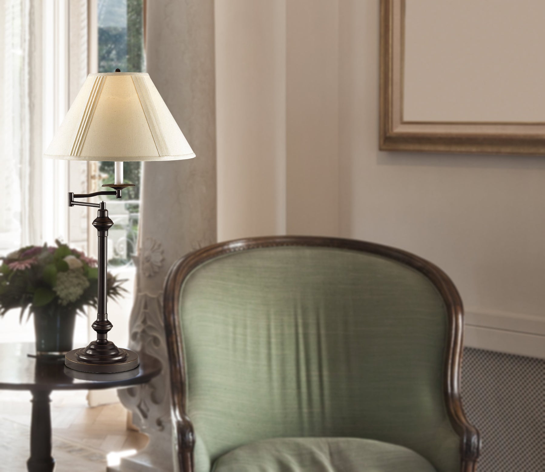 The BO-342-DB 150W 3 Way Swing Arm Table Lamp combines functionality with elegant design, featuring a durable metal construction and a fully functional swing arm that allows for versatile lighting options. Standing at 29.5 inches in height, this table lamp comes in a rich dark bronze finish and uses a spider type shade to diffuse light beautifully. With little to no assembly required and a generous six-foot power cord, it is easy to set up in any space. This lamp operates with a 3-way switch and utilizes an E26 bulb base, although the bulb is not included. Backed by a one-year warranty, this lamp ensures quality and durability.