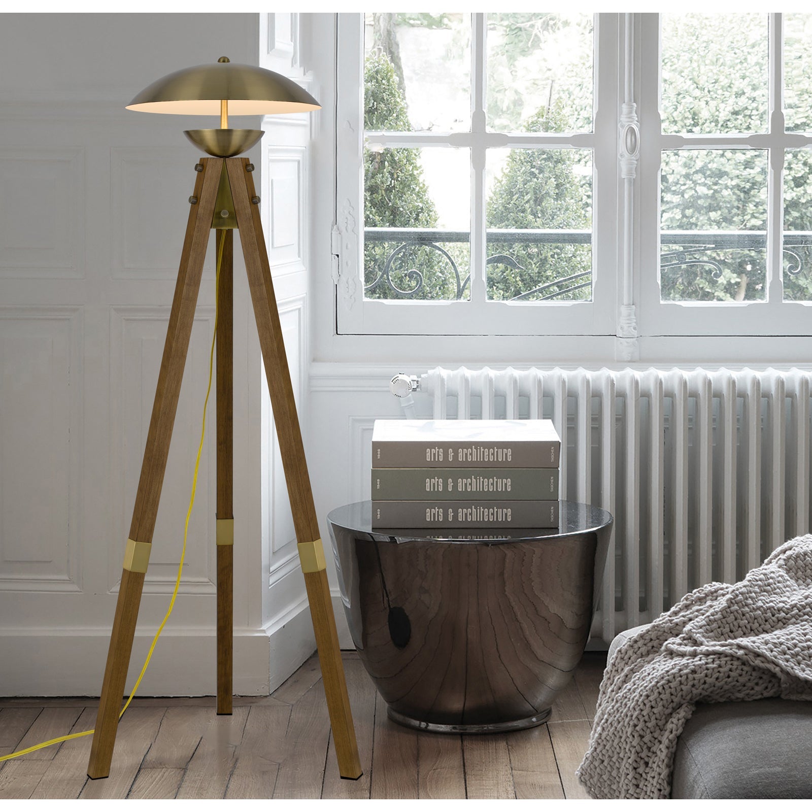The Lakeland 18W Integrated LED Tripod Birch Wood Floor Lamp is a stunning addition to any contemporary decor. Featuring a durable wood and metal construction, this lamp offers a bright 1200 lumen output powered by an 18W integrated LED. The brushed antique brass dome metal shade beautifully complements its elongated birch wood design. With a dimmable switch for adjustable lighting, this energy-efficient floor lamp is perfect for elevating your space. It ships in one carton and requires assembly. Backed by a one-year warranty, it ensures reliability and satisfaction.