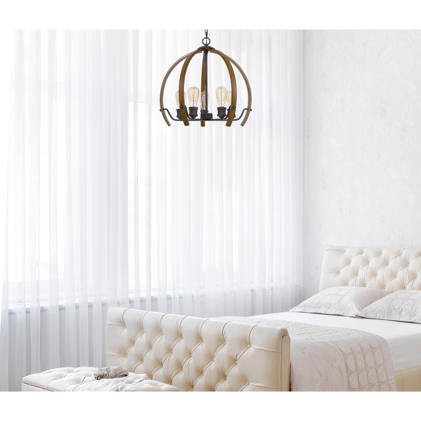 The FX-3764-5 Riverton Metal Chandelier is a striking lighting fixture that combines style and functionality. With a unique bird cage design and hand-applied faux oak wood finish, this chandelier adds a rustic charm to any space. It features a flat iron design and accommodates five bulbs with a maximum wattage of 60W each (optional Edison bulbs available). Measuring 20 5/8 inches in height, it's perfect for illuminating your dining room table or accenting your entryway. Constructed from durable metal, this chandelier is not only stylish but built to last.