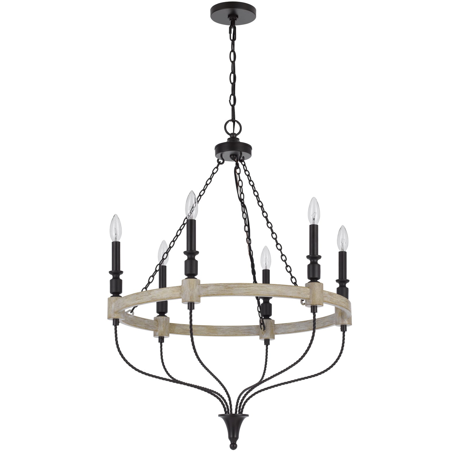 The FX-3793-6 Grove metal chandelier is a stunning centerpiece for your home, featuring a durable metal construction and a charming french country design. With six uplight candelabra-style bulbs (E12 base, 60W max) housed within a distressed wood wheel frame, this chandelier exudes rustic elegance. It comes in a sleek satin black finish and includes a canopy, 6-foot chain, and 10 feet of electrical wiring, providing versatile installation options. Assembly is required, and it typically ships within 3 business days, backed by a one-year warranty against defects in material and workmanship.