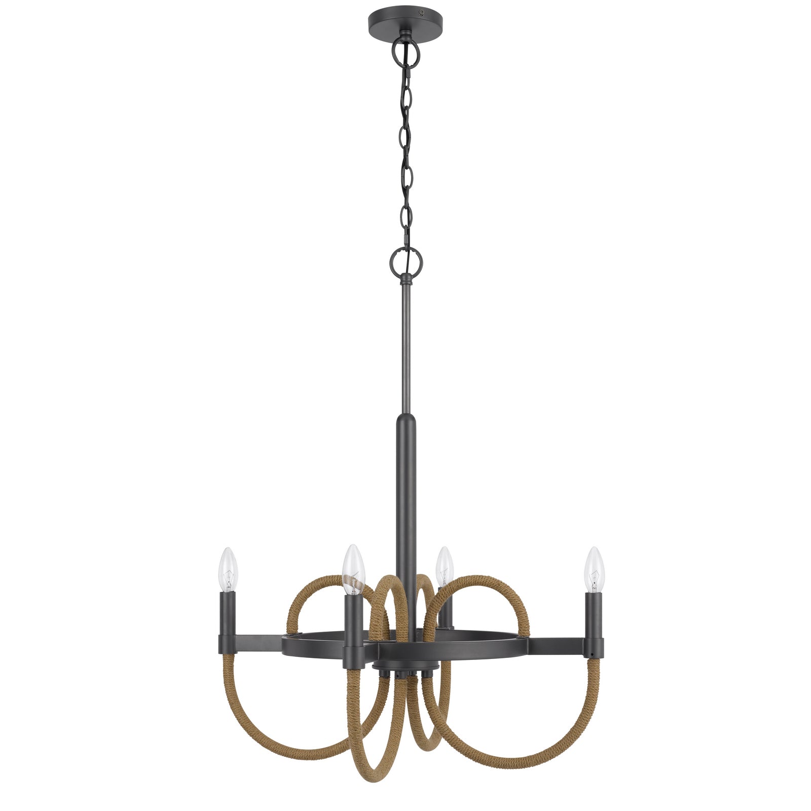 The Rowland 60W x 4 Metal/Burlap Roped Chandelier is a contemporary take on the classic candelabra style, perfect for elevating your home decor. This hardwired fixture features durable metal construction with elegant braided burlap accents, ensuring both style and longevity. It accommodates four E12 base bulbs (not included) with a maximum wattage of 60W each. The chandelier comes with a 72\