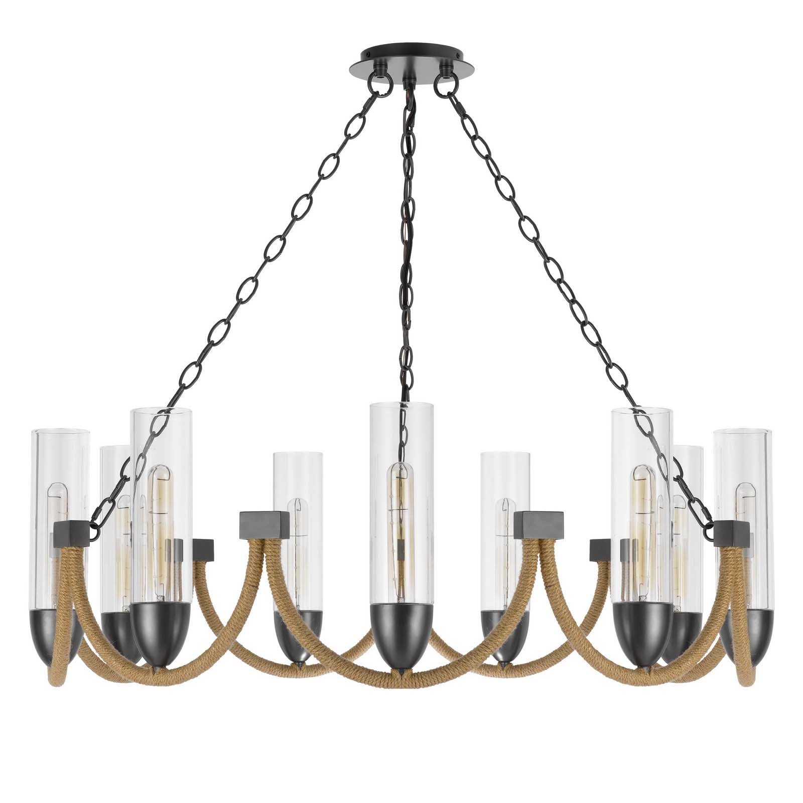 The FX-3815-9 Argyle Metal Chandelier is a stunning addition to any kitchen, living room, or dining room, offering a contemporary candelabra style. With a robust construction of durable metal and a captivating dark bronze finish complemented by brown rope accents, this chandelier features nine cylinder glass shades that require E26 base bulbs, each with a maximum wattage of 60W. Measuring 60W x 9, it includes a matching dark bronze canopy and ships with a 72-inch chain. Assembly is required, and it typically ships within three business days. Enjoy the peace of mind with a one-year warranty against defects in material and workmanship.