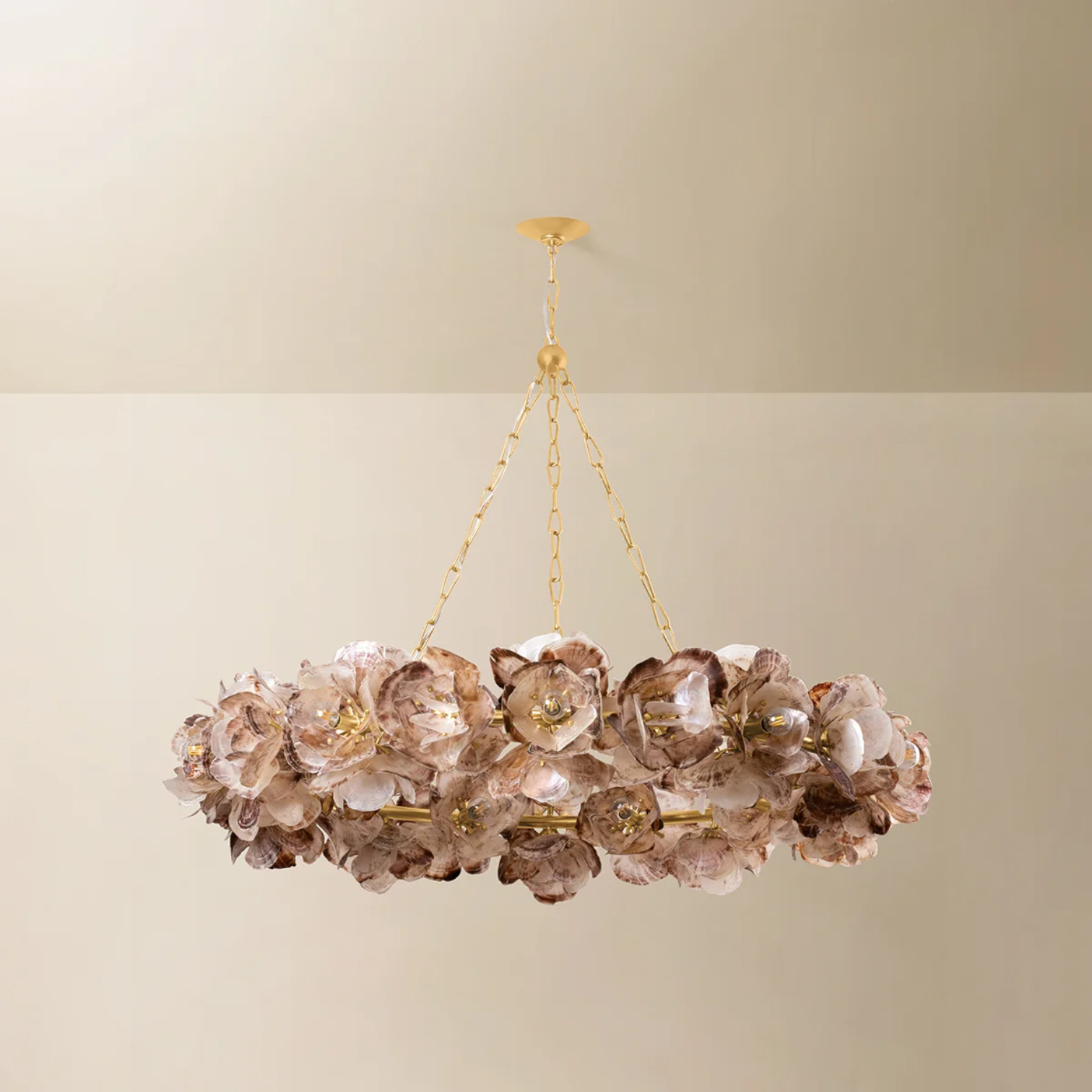 In an expression of organic splendor, clusters of flowers made from natural-colored oyster shells bloom around the Galle ring chandelier. Alternating lamped and unlamped shades create a glowing rhythm around the piece, while the pearlescent shells reflect and diffuse light. The delicate triple chain suspension is finished in Vintage Gold Leaf and accented by a decorative ball ornament, lending a jewelry-like elegance. Galle is available in two sizes with 14 or 20 lights.