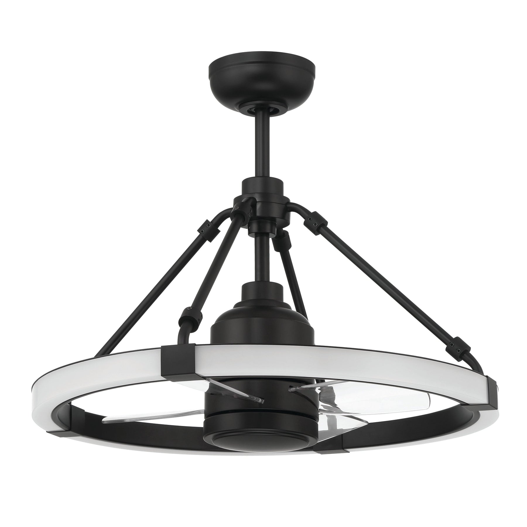 The Levy 24" Fandelier by Craftmade offers the convenience a Wi-Fi enabled, energy saving, 6-speed reversible DC motor ceiling fan surrounded by a sleek integrated 32 Watt dimmable 3000-5000 CCT LED ring. Featuring a set of three custom 19" polycarbonate blades, the fandelier can be controlled using the included handheld remote control or through the integrated Wi-Fi feature using the Bond app which allow access to additional functions including voice control, breeze, and timer functions compatible for use with most smart home devices, smartphones, and systems with no additional hub needed.