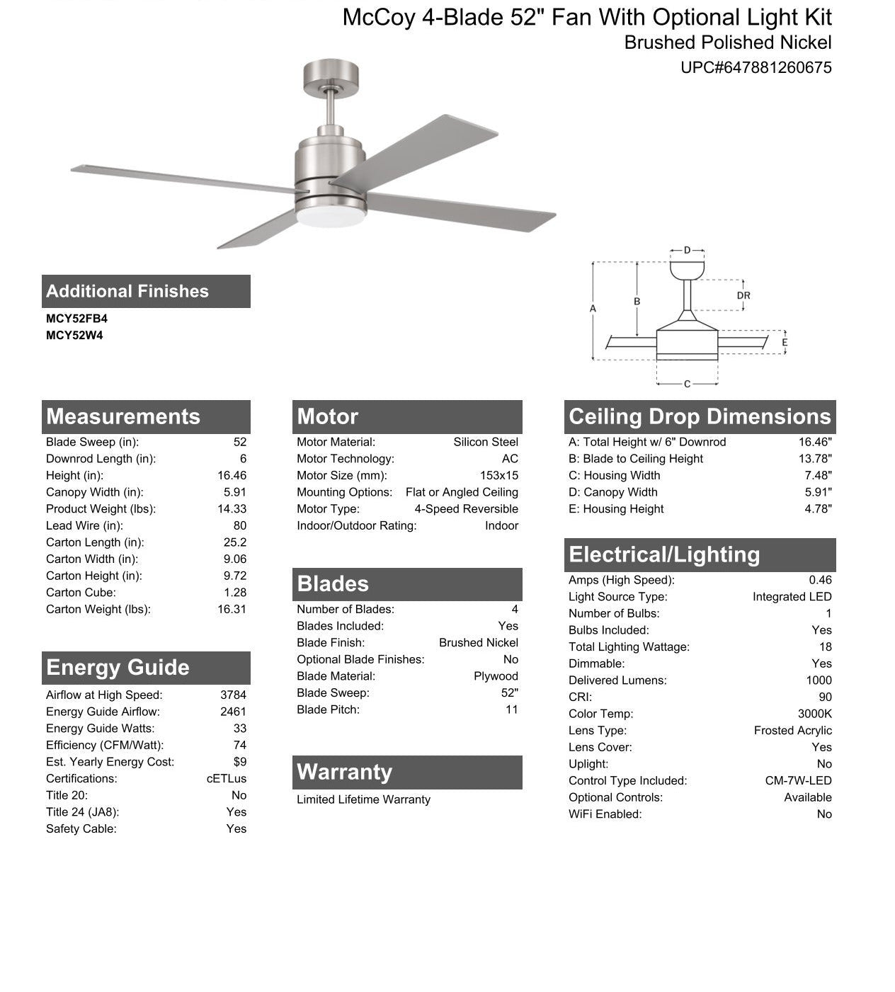 52" McCoy 4-Blade in Brushed Polished Nickel w/ Brushed Nickel Blades