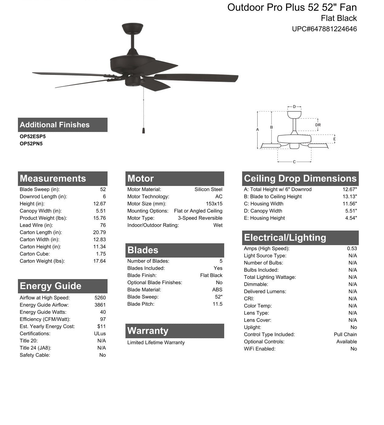 52" Outdoor Pro Plus 52 in Flat Black w/ Flat Black Blades