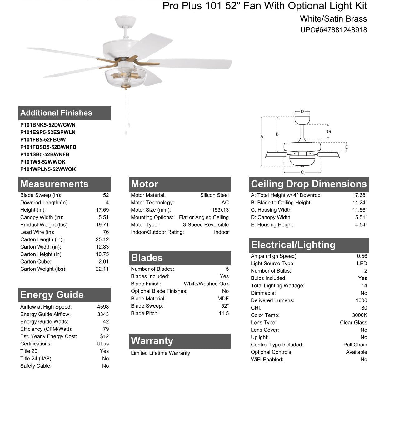 The ideal combination of excellent performance, exceptional value and timeless style, the Craftmade Pro Plus 52" ceiling fan with clear glass bowl light with non-dimmable LED bulbs included featuring a clean motor, updated straight blade arms and canopy is built for performance. The dual mount, 3-speed, reversible fan includes custom 52" reversible blades. Optional remote controls are available(Sold Separately).