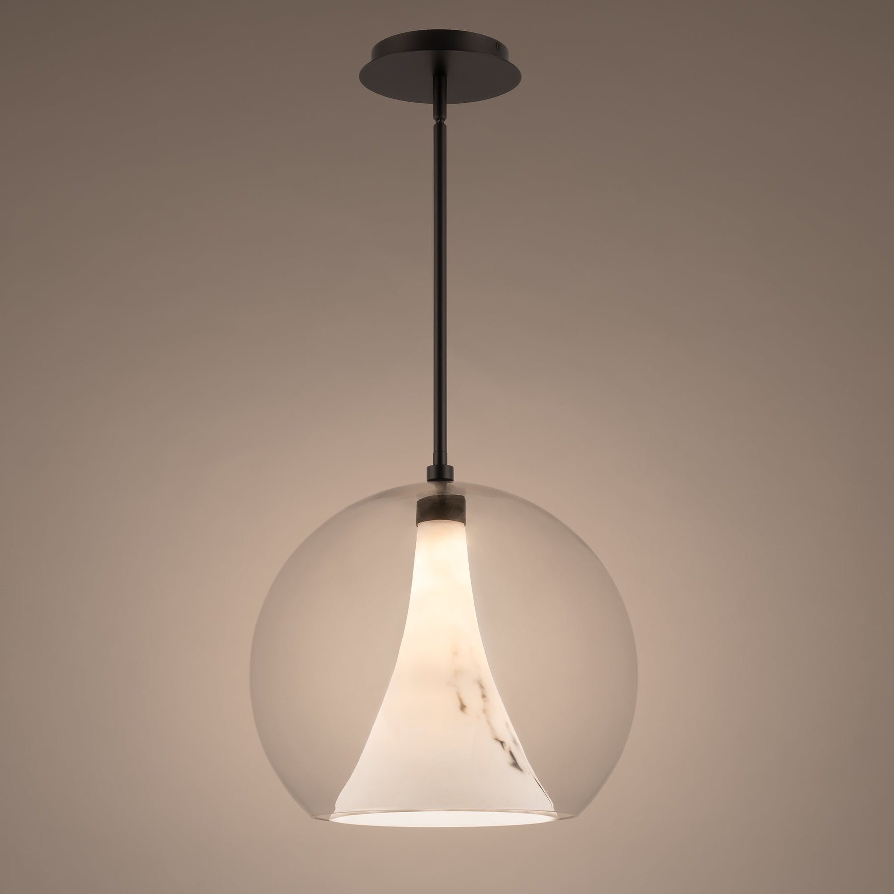 Chantilly 14in LED Pendant 3000K in Black. An unexpected first impression. Glowing alabaster captured within a clear crystal globe. Features aluminum construction, with a faux alabaster downlight interior and clear glass ball exterior 10ft of wire included to extend up to a maximum of 120in. Three 12in and one 6in downrods included (additional downrods sold separately). Universal Input Voltage Driver (120V-240V-277V) concealed within the canopy. Custom CCT options available by special order. Smooth and continuous dimming with an electronic low voltage (ELV) or TRIAC dimmer. High Powered Replaceable LED Module CRI: 90, Rated Hours: 50,000, Color Temp: 3000K Standards: ETL & cETL UL 1598 listed for Damp Locations.