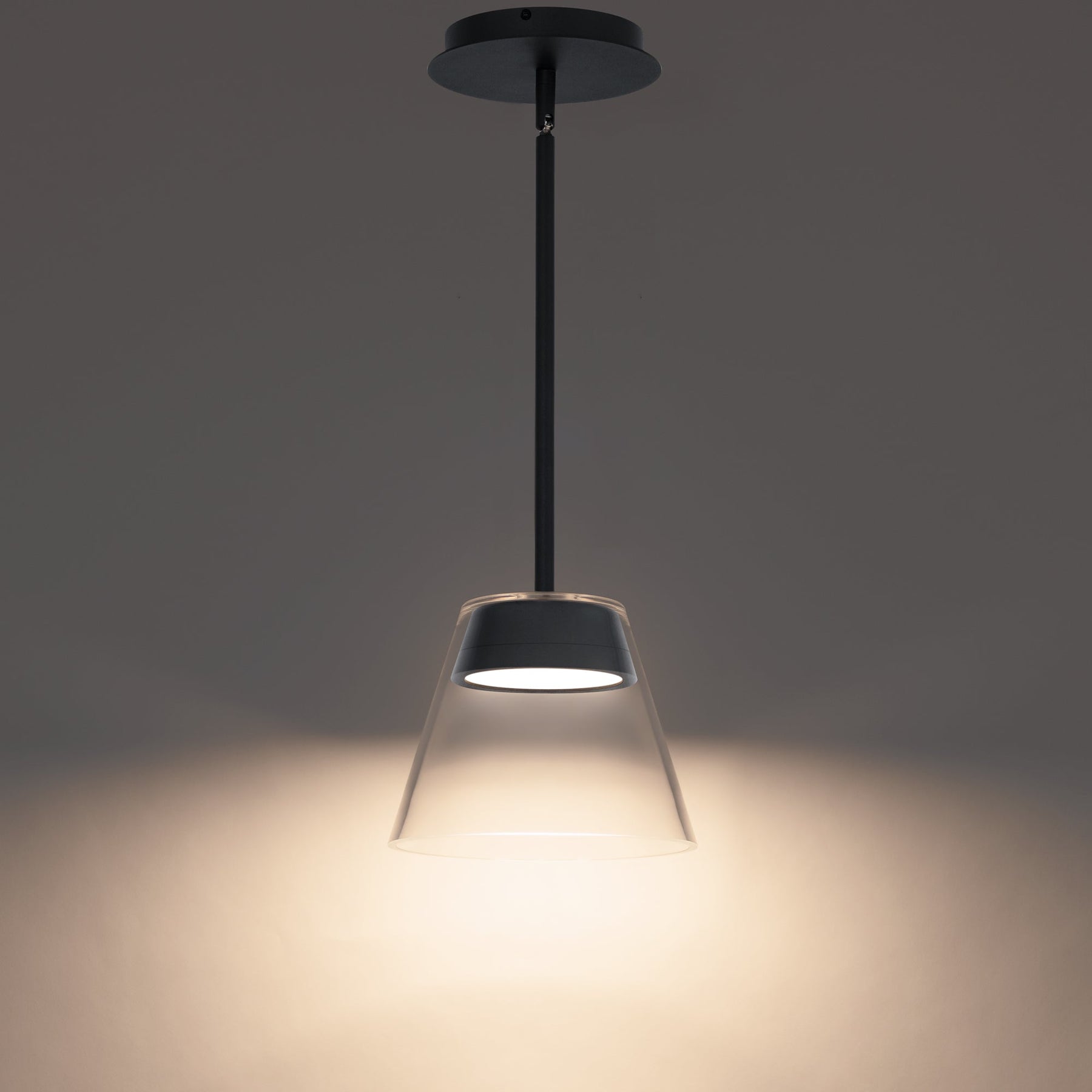 Chandra 7.5in LED Mini Pendant 3000K in Black. Chandra LED mini pendant from dweLED by WAC. This conical pendant features a slim minimalist body with a clear tapered thick wall and an aged brass or black downlight. Create a lovely design statement by grouping Chandra in a row over a kitchen island, counter, dining table or bar. This 14-inch mini LED pendant features a downlight with a clear glass shade. The CHANDRA style is also offered in a matching 8-inch size. Three 12 inch and one 6 inch down rods are included. A spin-on round canopy with minimal hardware can be mounted on a sloped ceiling. The Chandra LED Pendant uses ACLED driverless technology with a 3000K color temperature, high 90 color rendering index, and long lasting 50,000 hour rated life. Chandra operates on just 15 watts on a 120 volt system while delivering over 274 lumens and is California Title 24 rated to meet stringent energy savings standards. An aluminum body construction with a cone shaped clear glass shade provides wonderful downlight illumination. Chandra is damp location listed - can be used indoor or covered outdoor areas. 10ft of wire included to extend pendant up to a total of 120in. Includes 1x6in and 3x12in extension rods. Additional rods can be purchased separately for longer lengths. AC LED technology - no driver or transformer required. Easily fits on a pancake junction box. Sloped ceiling compatible. Smooth and continuous dimming with electronic low voltage ELV, or TRIAC dimmer options. High Powered Replaceable LED Module CRI: 90, Rated Hours: 50000, Color Temp: 3000K Standards: ETL & cETL UL 1598 listed with IP44 rating for Damp Locations. CEC Title 24 compliant.