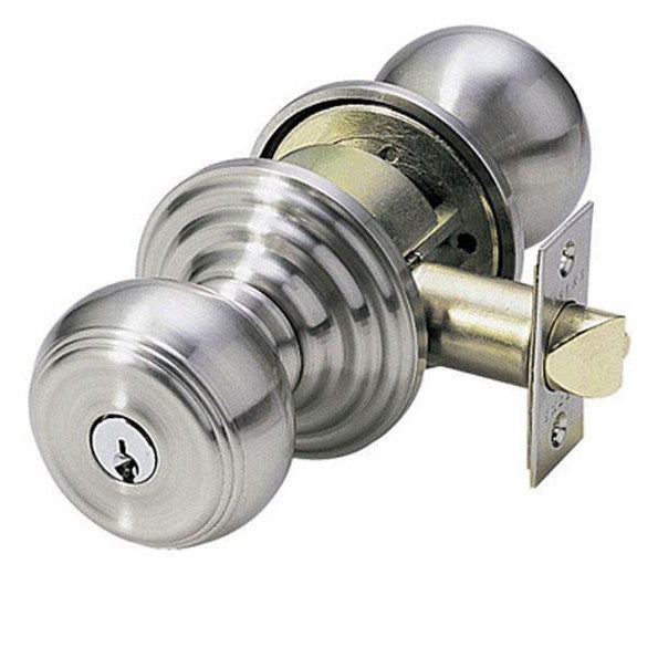 This key in door knob set from EmTek features a solid brass construction and a terrific brushed nickel finish. The knob measures 2 1/4 inches wide with a 2 11/16 inch projection. The regular rosette measures 2 3/4 inches wide. Includes adjustable latch (2 3/8 inches and 2 3/4 inches backsets), strikeplate, two levers and two door rosettes. This set is made for modern doors and it fits any door thickness between 1 1/4 inch to 1 7/8 inches thick. Key-In knobs are larger than double dummy and non-locking knobs to accommodate the lock. Available in a variety of other finishes. The average lead time for this knob is approximately 3 to 5 business days.