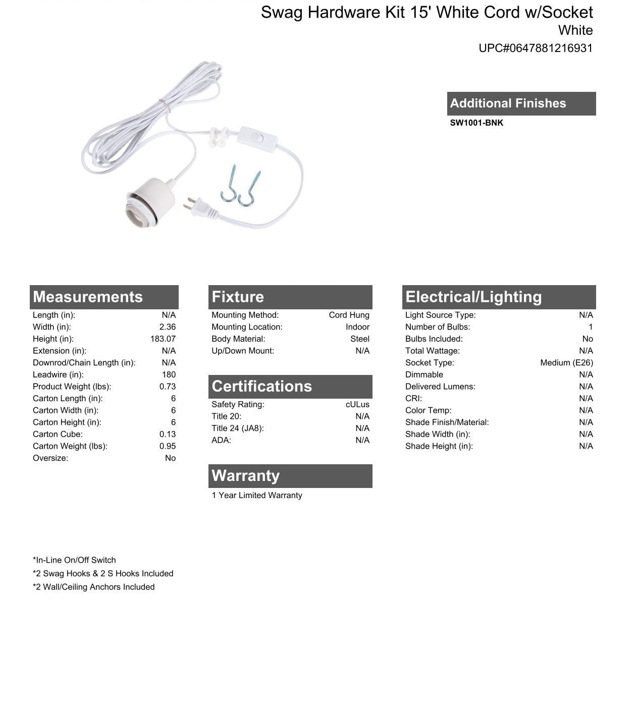 Swag Hardware Kit 15' White Cord w/Socket in White