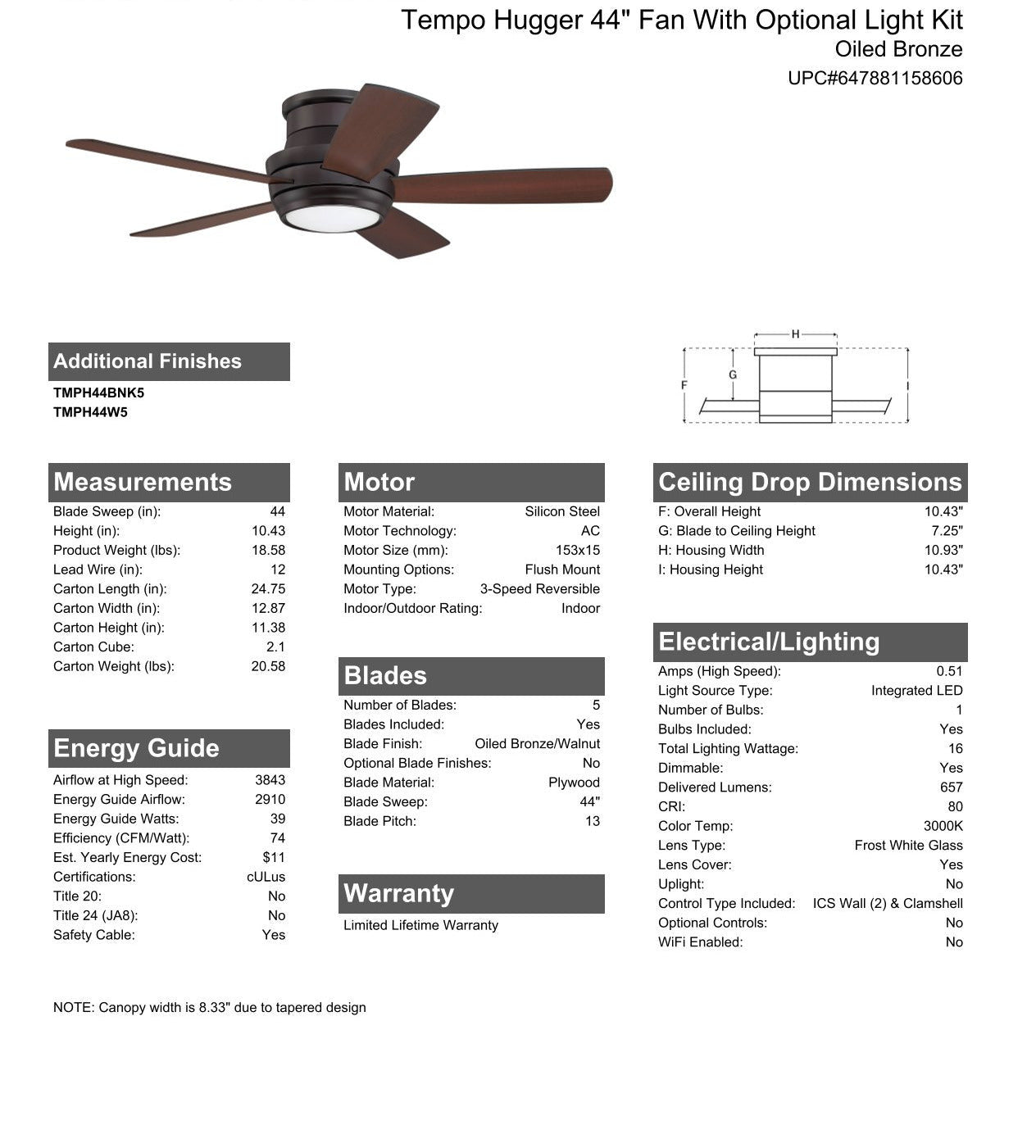 The Tempo 44" hugger fan is designed for smaller rooms and shorter ceilings. The sleek profile incorporates a 3-speed, reversible motor and dimmable LED down lighting with optional lens cover to enhance the form and function.
