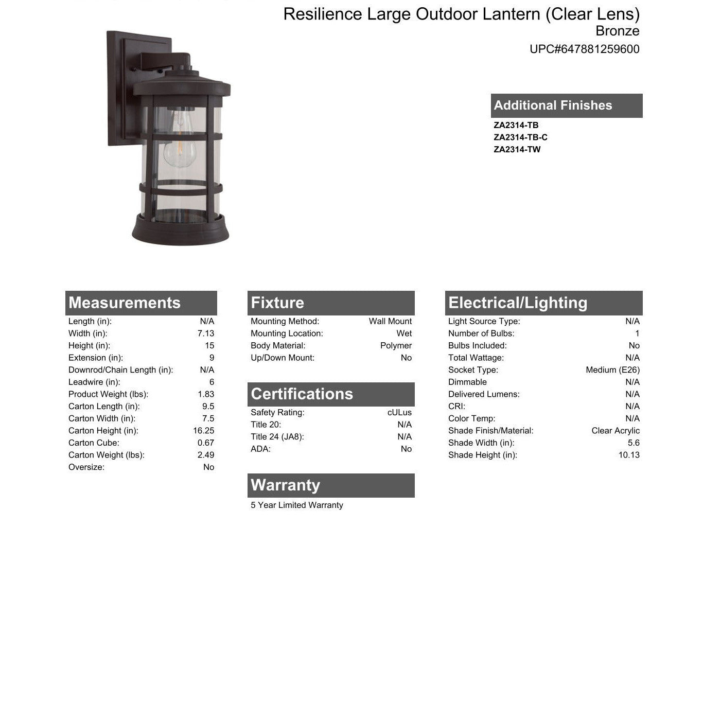Resilience Composite Lantern collection features classic styles constructed with durable non-corrosive UV-resistant resins warranted for 5 years, clear acrylic lens, and a convenient medium-based socket for the bulb of your choice(not included). These lanterns are at home even in the harshest environments.