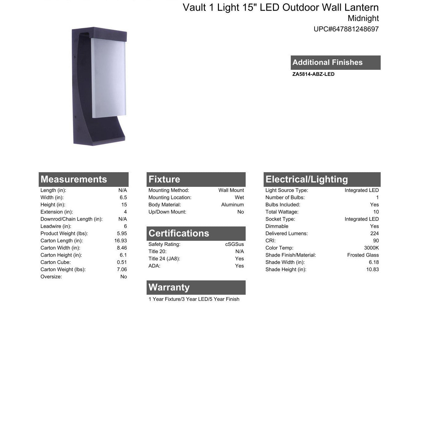 The indoor/outdoor wet rated Vault collection offering a strong visual statement with the curved back plate offsetting the dimmable LED illuminated white frosted glass is beautiful from any angle. The Vault collection offered in aged brushed bronze, a rich bronze with subtle highlights, and the dramatic midnight finish will provide illumination for years to come with our superior UV finish guaranteed for 5 years against fading.