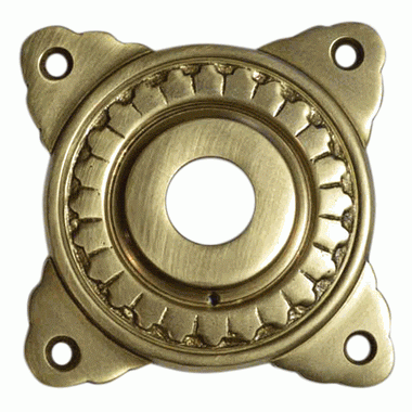 This art deco spare door part is made of solid brass and is made to fit a 2 1/8 inch bore hole. This rosette has a center-to-center mounting of 3 inches measured diagonally and has an overall diameter of 3 3/4 inches. Available in several finishes and comes complete with mounting hardware.