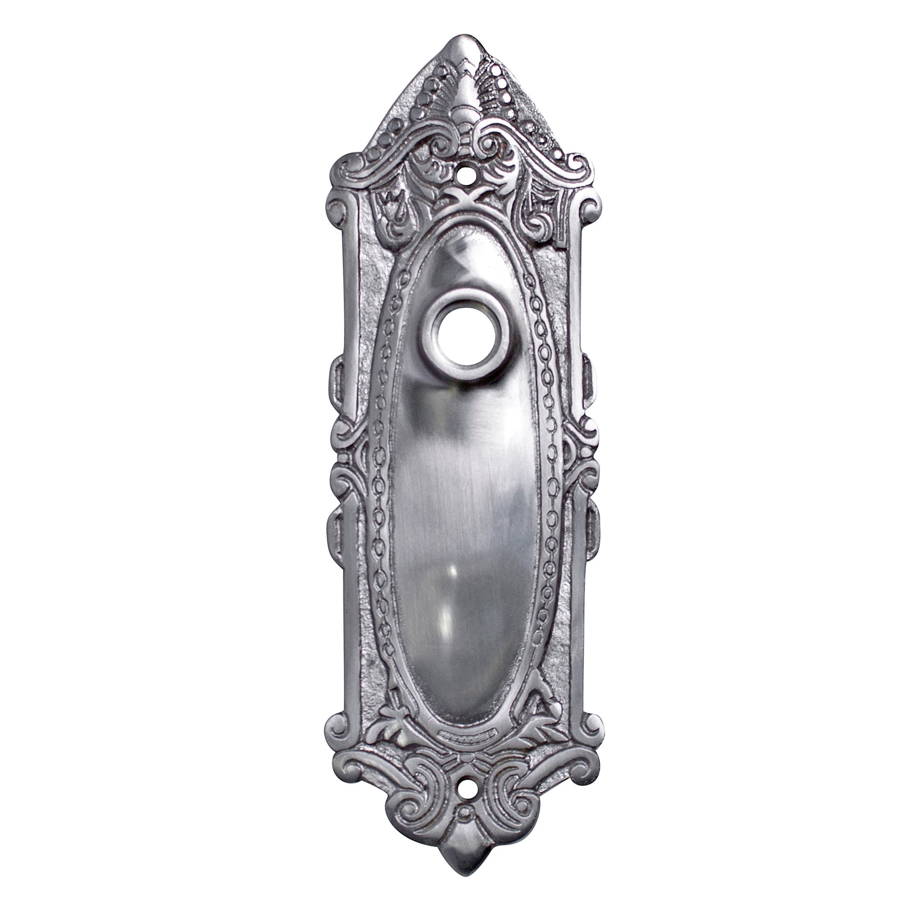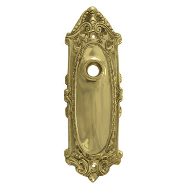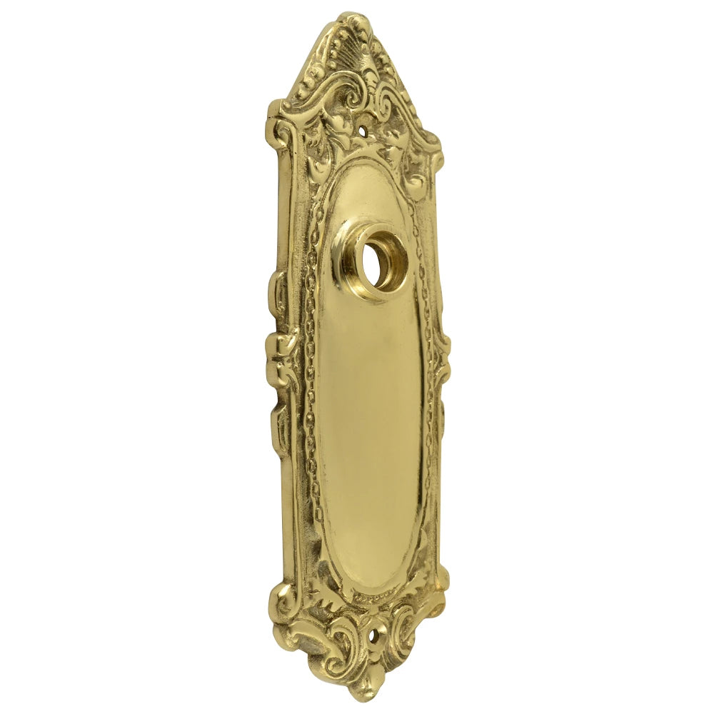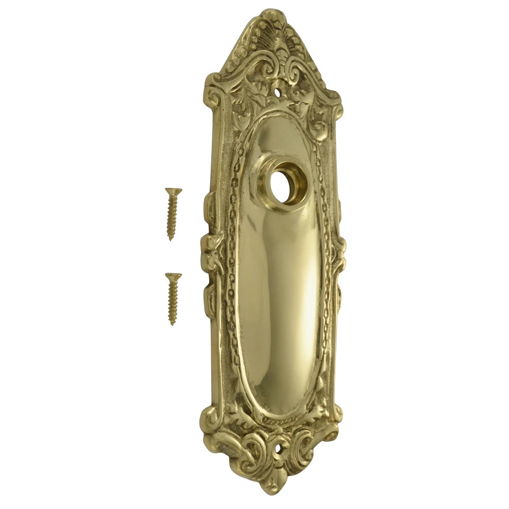 7 1/4 Inch Solid Brass Ornate Victorian Back Plate. Ornate Victorian scroll pattern design around border. Measures 7 1/4 inches tall and 2 1/2 inches wide. Comes complete with the mounting hardware. Sold individually.