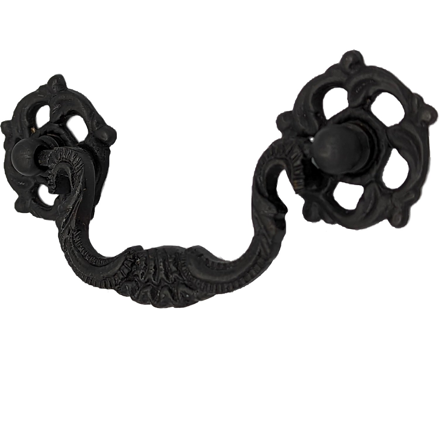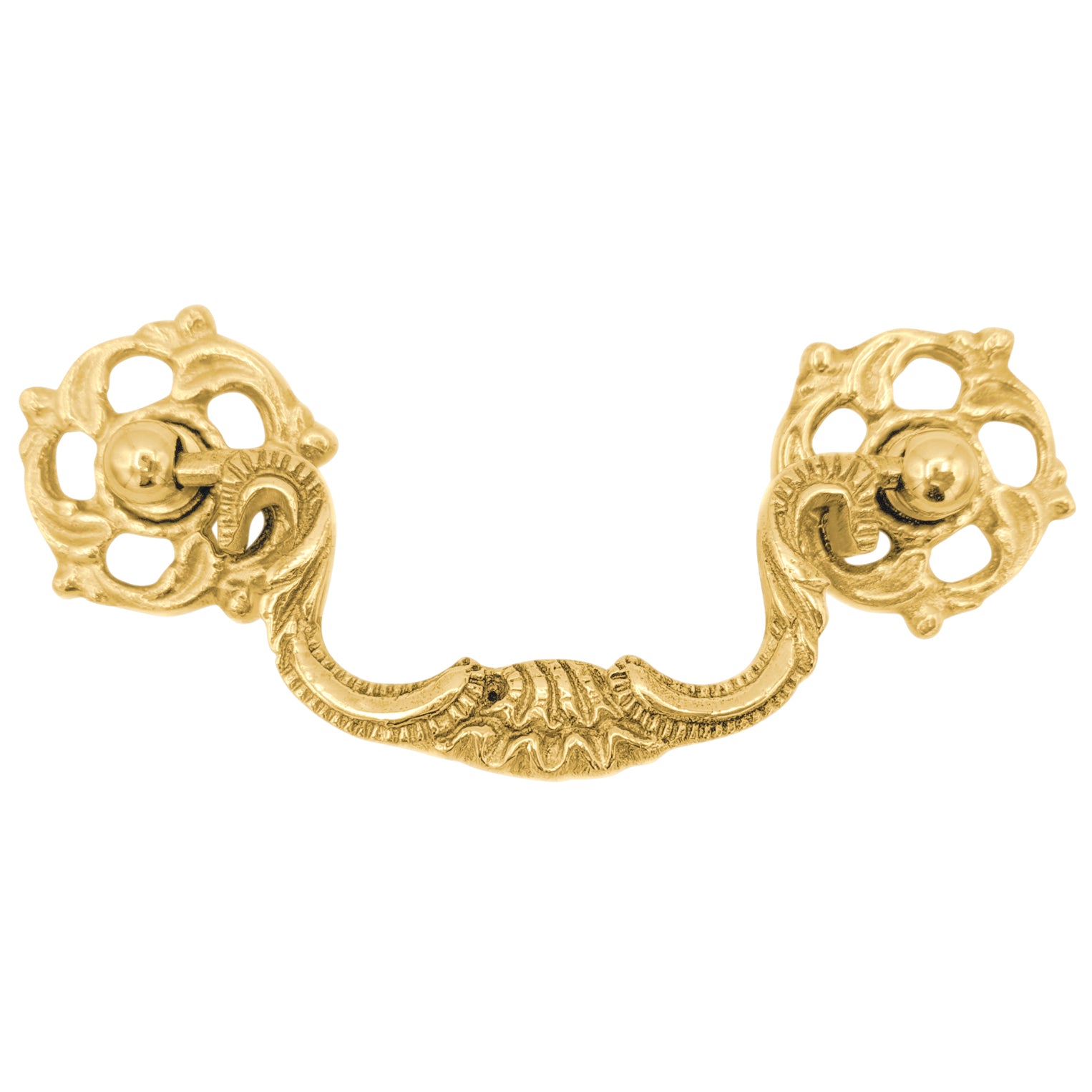This bail pull measures 4 1/2 inches wide by 1 inch tall with a 1 inch projection and a 1 1/2 inch drop. This bail pull comes complete with all mounting hardware and features several finishes, including polished brass, antique brass, Black Bronze, polished chrome and Satin Nickel.