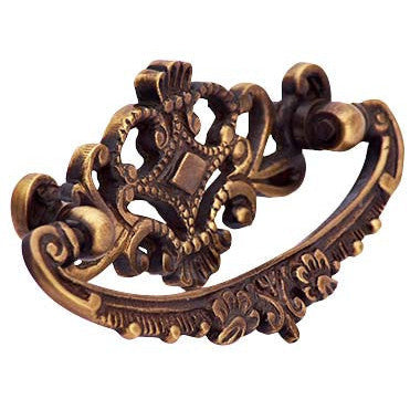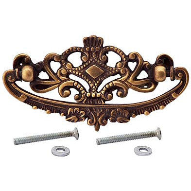 4 1/8 Inch Solid Brass Ornate Victorian Pull (Antique Brass Finish) - measures 4 1/8 inch long and 2 1/4 inch tall with a 1/2 inch projection. Center-to-center spacing measures 3 inch (76.2 mm 3.00 c-c). Comes complete with mounting hardware. Available in Polished Brass, Antique Brass (shown), Black Bronze, Polished Chrome, Satin Nickel, and Flat Black finishes.
