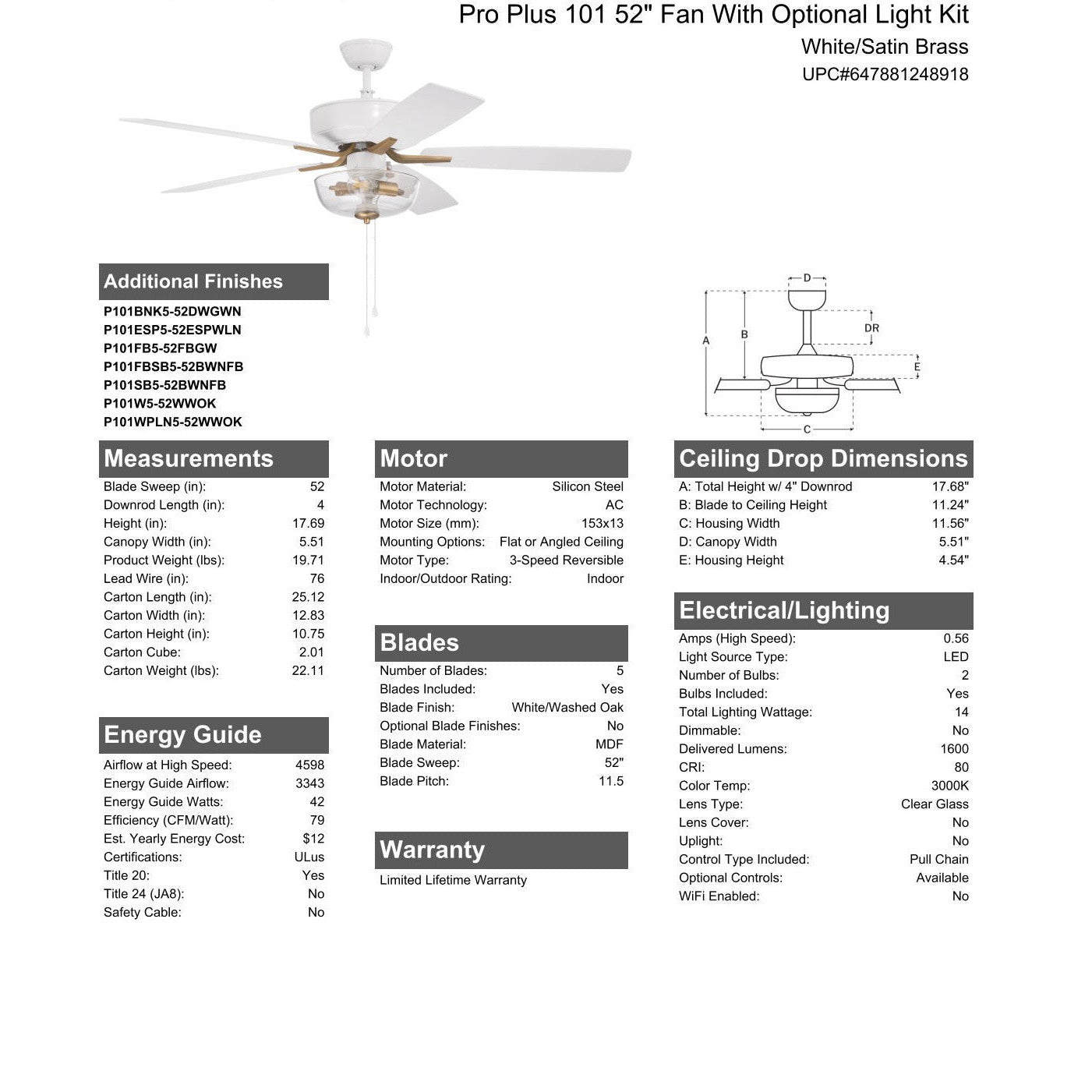 52" Pro Plus 101 in White/Satin Brass w/ White/Washed Oak Blades