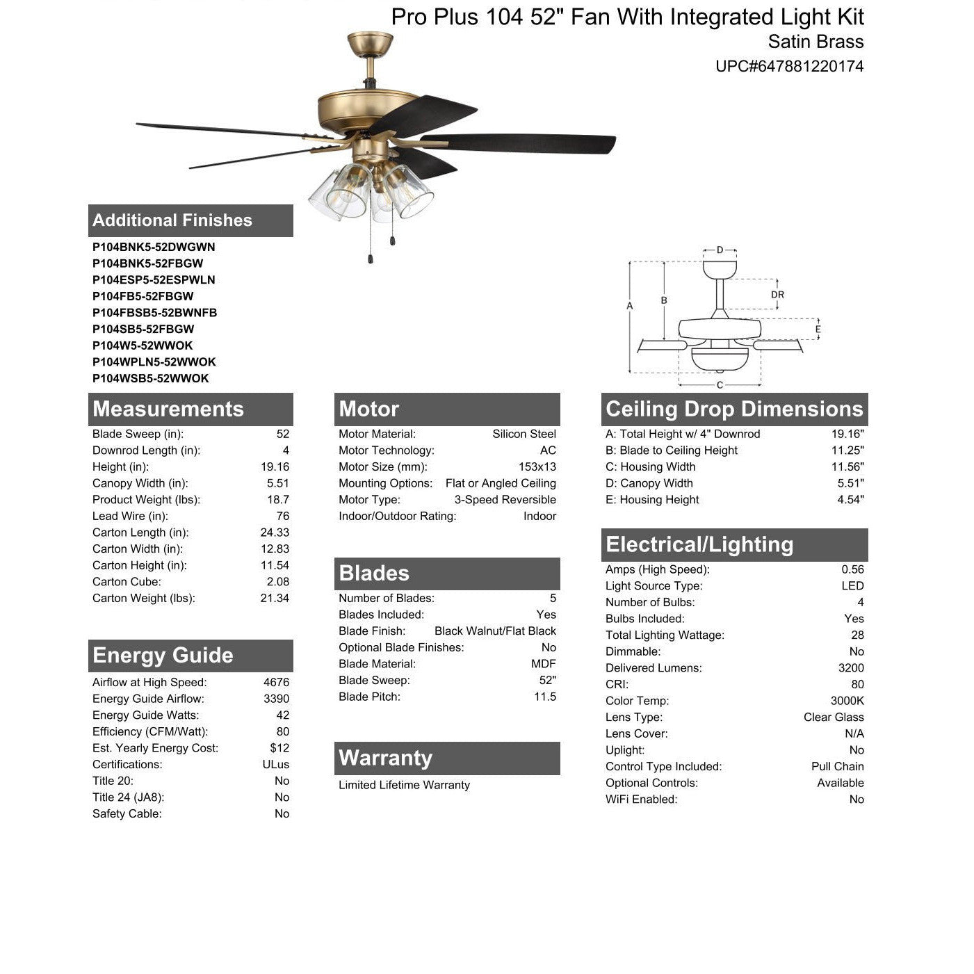 52" Pro Plus 104 in Satin Brass w/ Black Walnut/Flat Black Blades