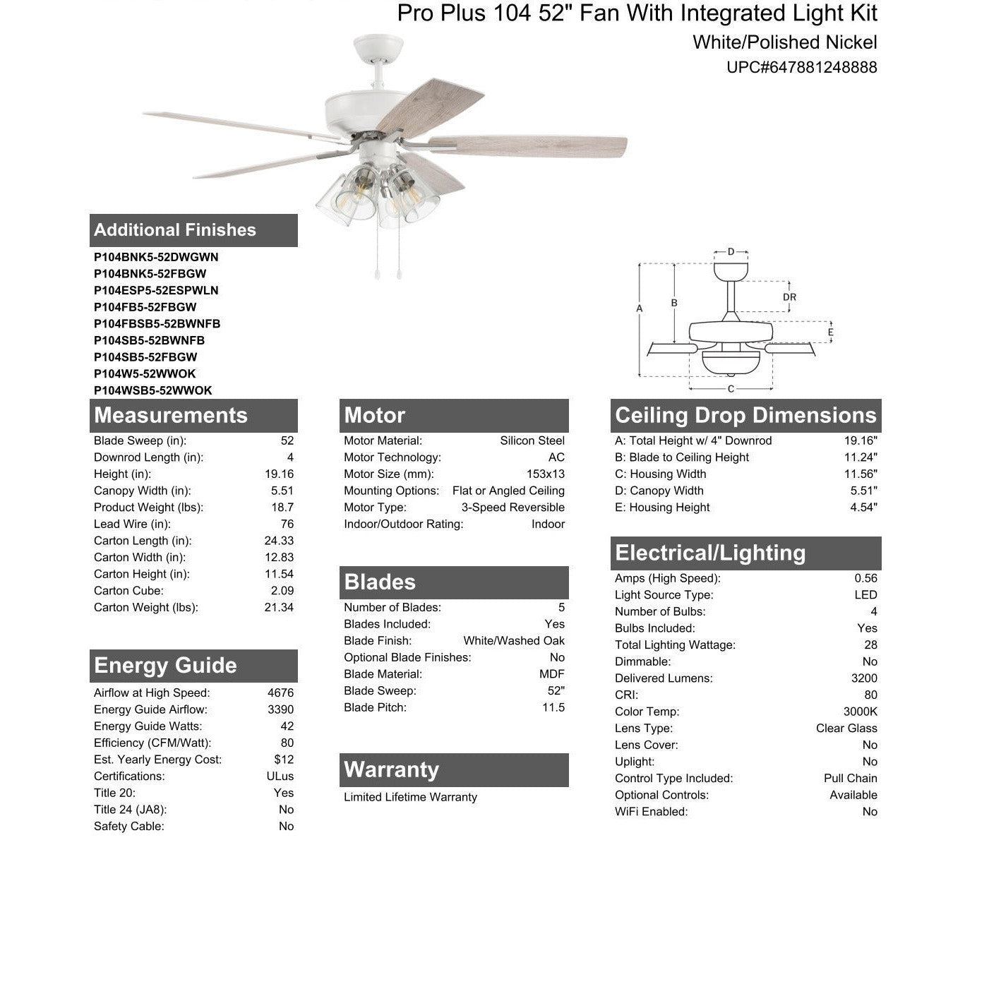 The ideal combination of excellent performance, exceptional value and timeless style, the Craftmade Pro Plus 52" ceiling fan with clear glass four light with non-dimmable LED bulbs included featuring a clean motor, updated straight blade arms and canopy is built for performance. The dual mount, 3-speed, reversible fan includes custom 52" reversible blades. Optional remote controls are available(Sold Separately).