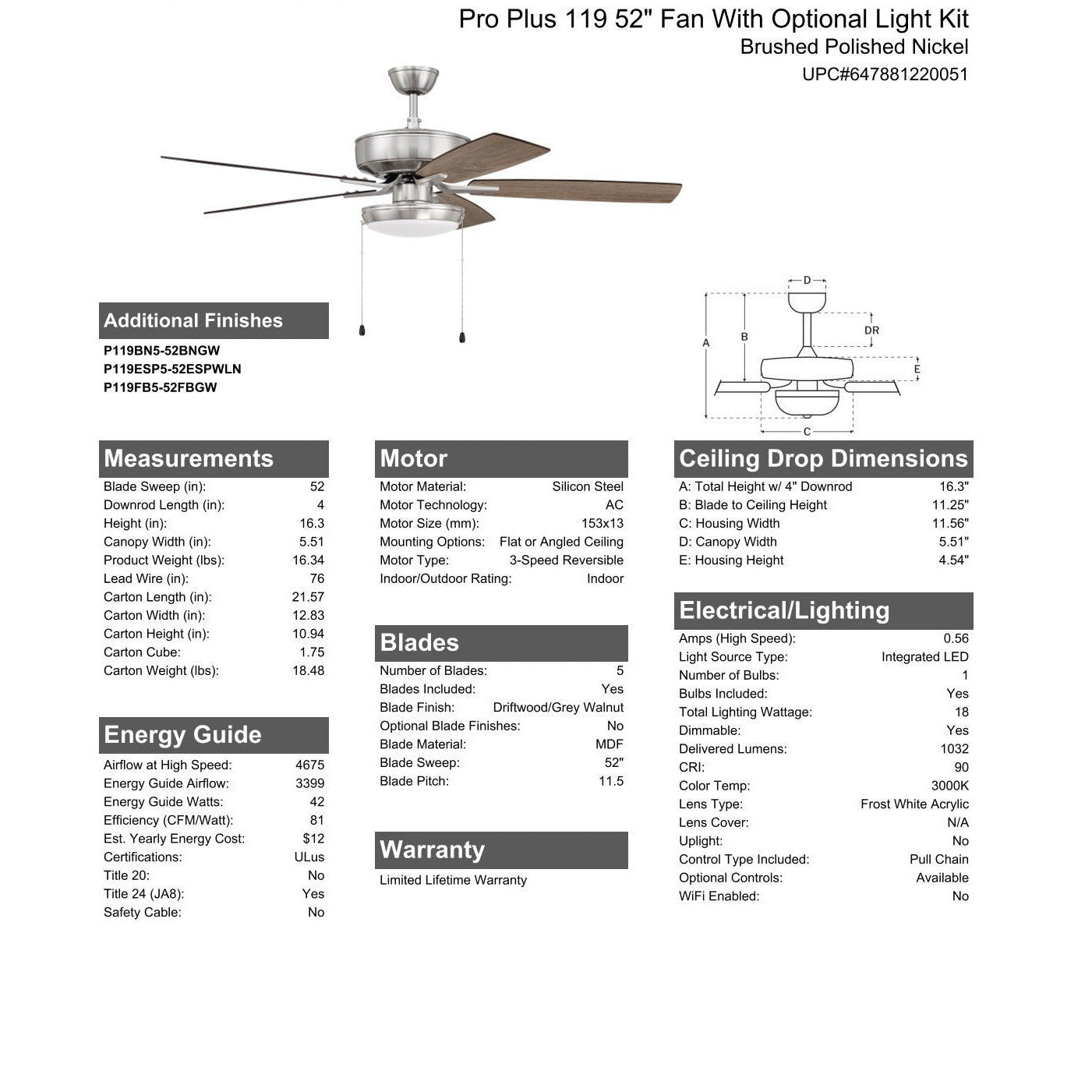 The ideal combination of excellent performance, exceptional value and timeless style, the Craftmade Pro Plus 52" ceiling fan with integrated frost white dimmable LED pan light included featuring a clean motor, updated straight blade arms and canopy is built for performance. The dual mount, 3-speed, reversible fan includes custom 52" reversible blades. Optional remote controls are available(Sold Separately).