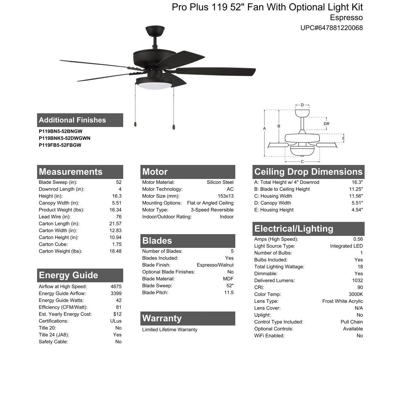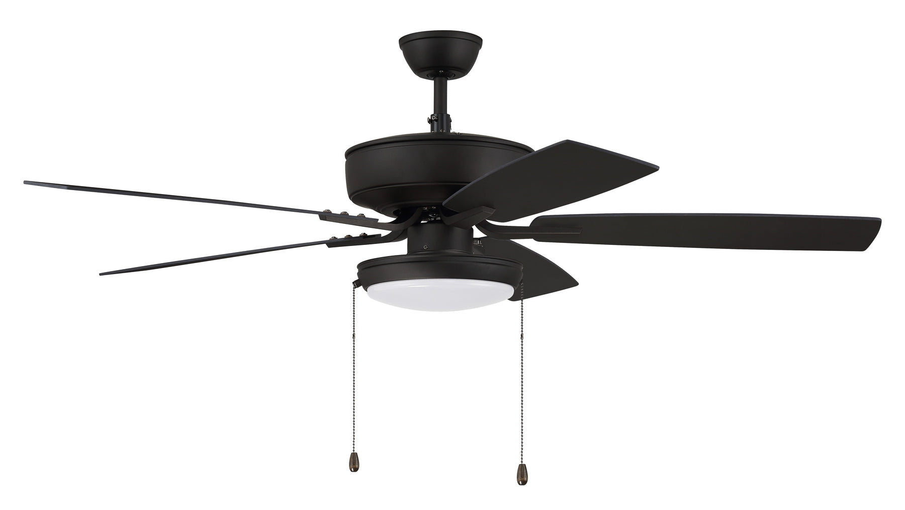 The ideal combination of excellent performance, exceptional value and timeless style, the Craftmade Pro Plus 52" ceiling fan with integrated frost white dimmable LED pan light included featuring a clean motor, updated straight blade arms and canopy is built for performance. The dual mount, 3-speed, reversible fan includes custom 52" reversible blades. Optional remote controls are available(Sold Separately).