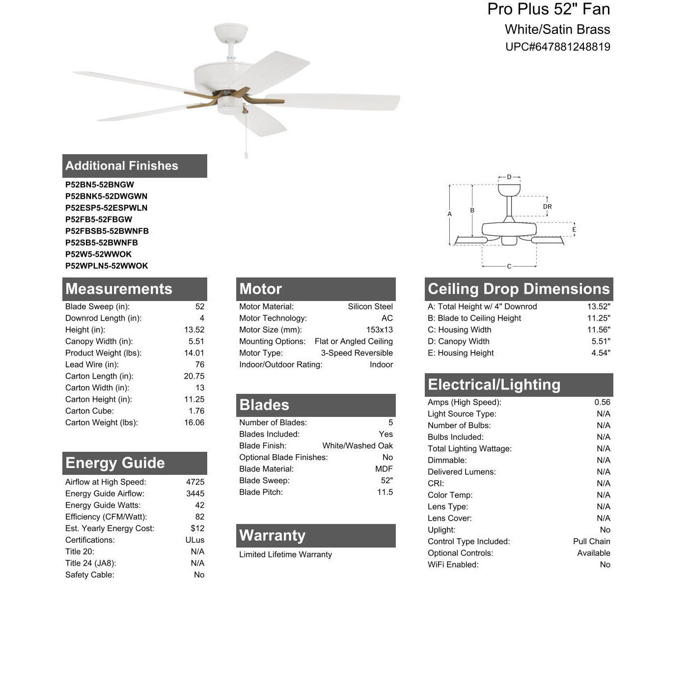 The ideal combination of excellent performance, exceptional value and timeless style, the Craftmade Pro Plus 52" ceiling fan featuring a clean motor, updated straight blade arms and canopy is built for performance. The dual mount, 3-speed, reversible fan includes custom 52" reversible blades. Optional light kits and remote controls are available(Sold Separately).